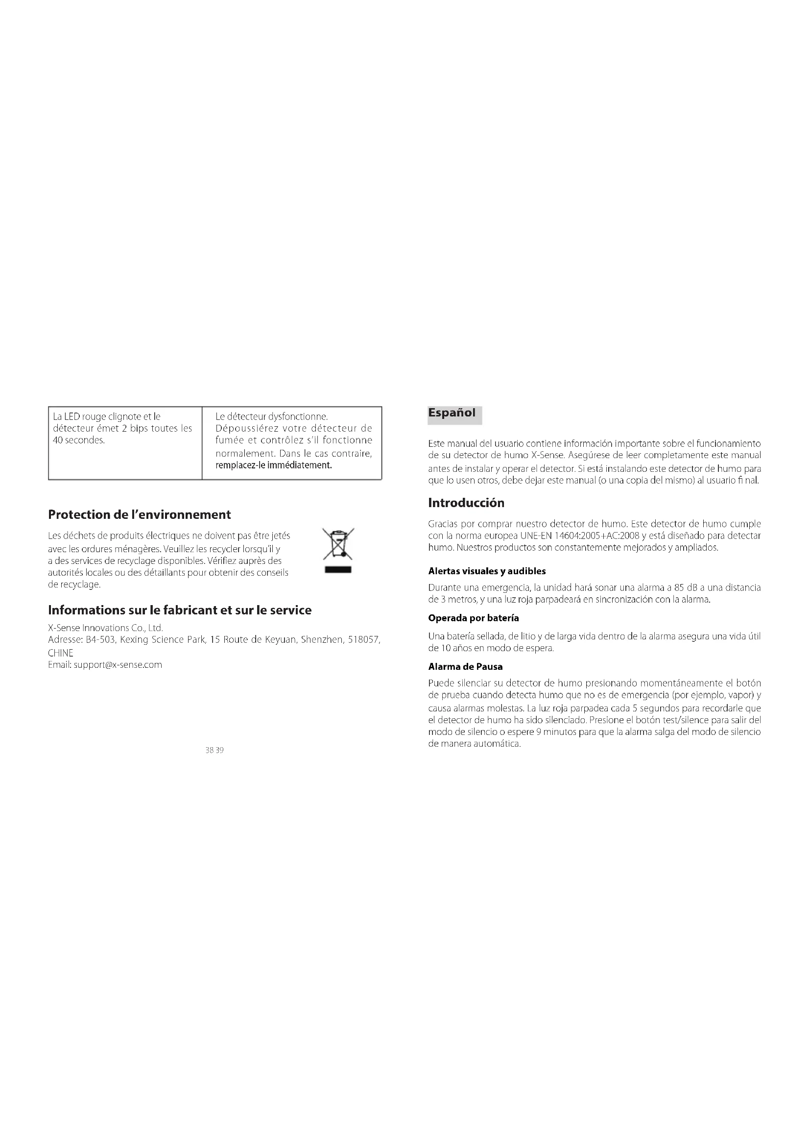 - Nettoyez le détecteur (voir « Entretien »). La LED rouge clignote et le détecteur émet 1 bip toutes les 60 secondes La pile est faible. Remplacez immédiatement le détecteur par un nouveau, la pile étant intégrée dans l’appareil et pas remplaçable.38 39 La LED rouge clignote et le détecteur émet 2 bips toutes les 40 secondes. Le détecteur dysfonctionne. Dépoussiérez votre détecteur de fumée et contrôlez s’il fonctionne normalement. Dans le cas contraire, remplacez-le immédiatement. Protection de l’environnement Les déchets de produits électriques ne doivent pas être jetés avec les ordures ménagères. Veuillez les recycler lorsqu’il y a des services de recyclage disponibles. Vérifiez auprès des autorités locales ou des détaillants pour obtenir des conseils de recyclage. Informations sur le fabricant et sur le service X-Sense Innovations Co., Ltd. Adresse: B4-503, Kexing Science Park, 15 Route de Keyuan, Shenzhen, 518057, CHINE Email: support@x-sense.com Español Este manual del usuario contiene información importante sobre el funcionamiento de su detector de humo X-Sense. Asegúrese de leer completamente este manual antes de instalar y operar el detector. Si está instalando este detector de humo para que lo usen otros, debe dejar este manual (o una copia del mismo) al usuario fi nal. Introducción Gracias por comprar nuestro detector de humo. Este detector de humo cumple con la norma europea UNE-EN 14604:2005+AC:2008 y está diseñado para detectar humo. Nuestros productos son constantemente mejorados y ampliados. Alertas visuales y audibles Durante una emergencia, la unidad hará sonar una alarma a 85 dB a una distancia de 3 metros, y una luz roja parpadeará en sincronización con la alarma. Operada por batería Una batería sellada, de litio y de larga vida dentro de la alarma asegura una vida útil de 10 años en modo de espera. Alarma de Pausa Puede silenciar su detector de humo presionando momentáneamente el botón de prueba cuando detecta humo que no es de emergencia (por ejemplo, vapor) y causa alarmas molestas. La luz roja parpadea cada 5 segundos para recordarle que el detector de humo ha sido silenciado. Presione el botón test/silence para salir del modo de silencio o espere 9 minutos para que la alarma salga del modo de silencio de manera automática.40 41 Advertencia de batería baja y fallo Esta alarma provee una advertencia visual y audible cuando la batería está baja o si hay un fallo. La alarma pita una vez y el indicador LED rojo parpadea cada 60 segundos cuando la batería está baja. La alarma pita dos veces y el indicador LED rojo parpadea cada 40 segundos cuando la alarma tiene un fallo. Contenido del paquete Información de seguridad IMPORTANTE