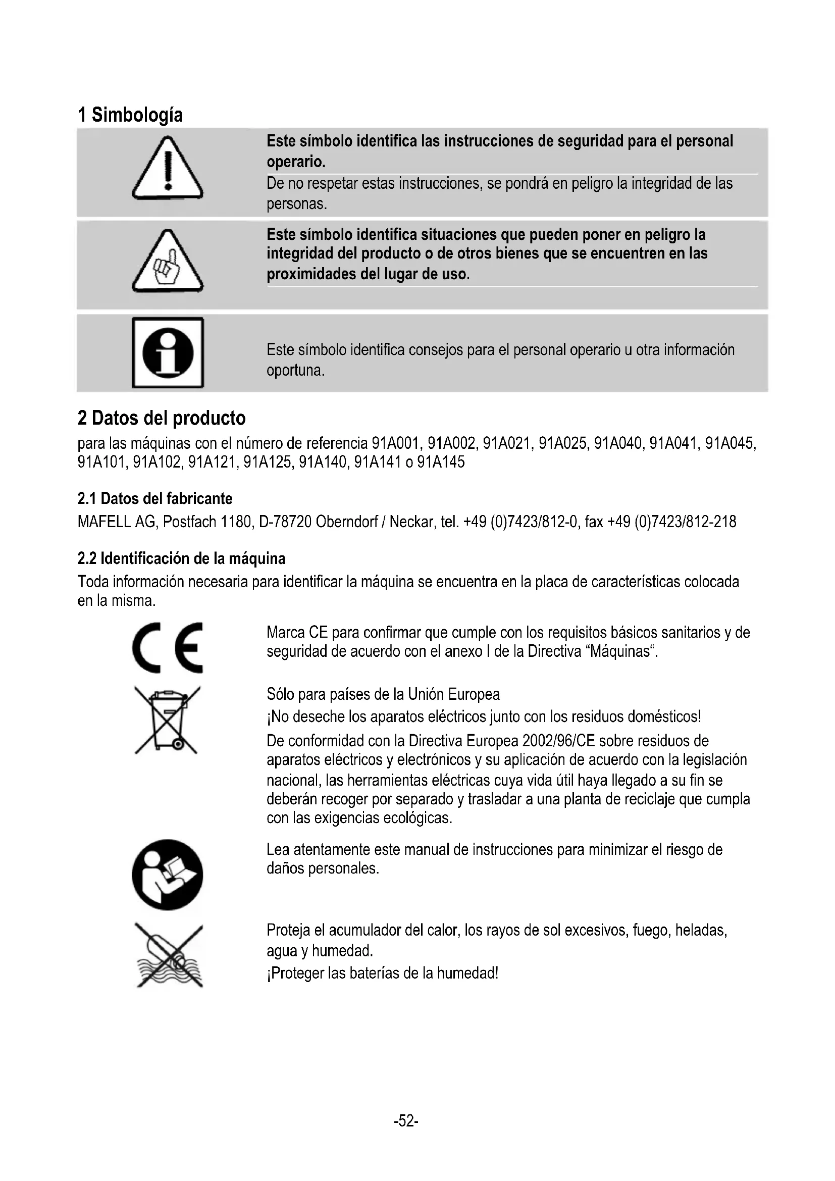 7 Eliminación de fallos técnicos ........................................................................................ 58 8 Accesorios especiales.................................................................................................... 59 9 Dibujo de explosión y lista de piezas de recambio.........................................................59-52- 1 Simbología Este símbolo identifica las instrucciones de seguridad para el personal operario. De no respetar estas instrucciones, se pondrá en peligro la integridad de las personas. Este símbolo identifica situaciones que pueden poner en peligro la integridad del producto o de otros bienes que se encuentren en las proximidades del lugar de uso. Este símbolo identifica consejos para el personal operario u otra información oportuna. 2 Datos del producto para las máquinas con el número de referencia 91A001, 91A002, 91A021, 91A025, 91A040, 91A041, 91A045, 91A101, 91A102, 91A121, 91A125, 91A140, 91A141 o 91A145