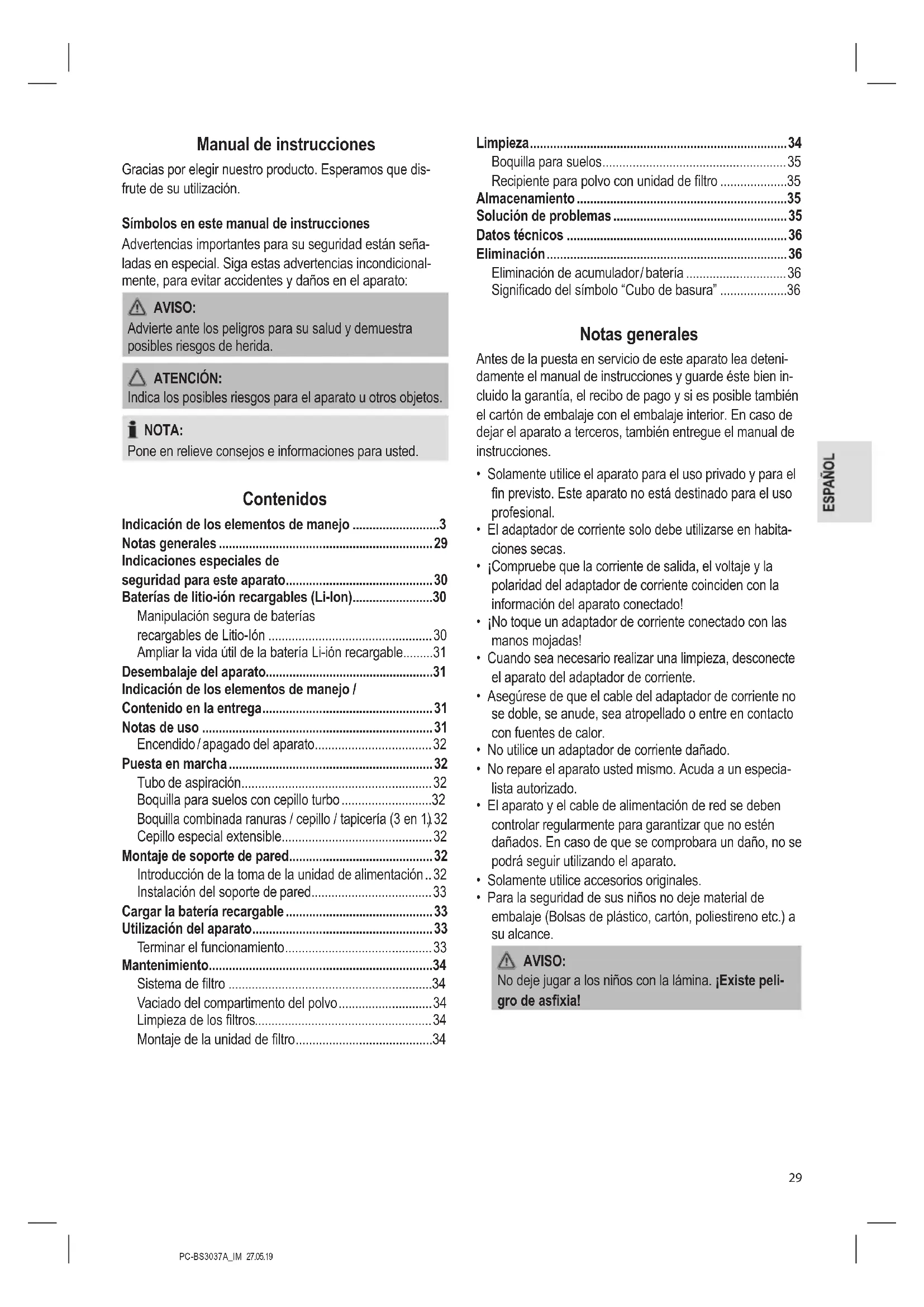 Problema Causa posible Solución Baja potencia de succión. Batería recargable casi descargada. Cargue la batería recargable. Recipiente para polvo lleno. Vacíe el recipiente del polvo. Los ltros están sucios. Limpie los ltros como se describe en “Mantenimiento”. ATENCIÓN: ¡Vuelva a utilizar la aspiradora exclusivamente con ltros secos! Ruidos durante el uso. Se ha aspirado un cuerpo extraño en la boquilla para suelos. Saque el cuerpo extraño. En caso necesario, desconecte la boquilla para suelos del conducto de succión. La boquilla para suelos con cepillo turbo no funciona. Rodillo de cepillo obstruido por suciedad. Limpie la boquilla para suelos como se describe en “Limpieza”. Instalación incorrecta del conducto de succión y / o la boquilla para suelos. Compruebe que todos los elementos están montados correctamente. La batería recargable no mantiene la carga. La batería recargable ha llegado al nal de su vida útil. Contacte con nuestro departamento de servicio o su vendedor. Datos técnicos Modelo: ........................................................... PC-BS 3037 A Peso neto (unidad manual con tubo de aspiración y boquilla de suelo): .................... aprox. 2,4 kg Toma de corriente Clase de protección: ............................................................ Entrada: ........................ CA 100 - 240 V, 50 / 60 Hz, 0,8 A MAX Salida: ..........................................................CC 35 V, 500 mA Polaridad: ................................................................... Batería recargable: .........................29,6 V, 2200 mAh Li-ión Tiempo de funcionamiento: ...............Máximo de 30 minutos Tiempo de carga: ..........................................aprox. 4,5 horas El derecho de realizar modicaciones técnicas y de diseño en el curso del desarrollo continuo del producto está reservado. Este aparato se ha examinado según las normativas actuales y vigentes de la Comunidad Europea, como p.ej. compatibilidad electromagnética y directiva de baja tensión y se ha construido según las más nuevas especicaciones en razón de la seguridad. Eliminación Eliminación de acumulador / batería La unidad contiene una batería recargable. Las baterías / acumuladores usados (baterías recar- gables) no se corresponden con los residuos domésticos. La batería debe retirarse antes de reciclar el producto. Pulse el pestillo de liberación (6) y extraiga la batería recargable de la unidad manual. Puede obtener información del lugar de eliminación de baterías / acumuladores de su autoridad local o municipal. Signicado del símbolo “Cubo de basura” Proteja nuestro medio ambiente, aparatos eléc- tricos no forman parte de la basura doméstica. Haga uso de los centros de recogida previstos para la eliminación de aparatos eléctricos y entregue allí sus aparatos eléctricos que no vaya a utilizar más. Ayudará en evitar las potenciales consecuencias, a causa de una errónea eliminación de desechos, para el medio ambiente y la salud humana. Con ello, contribuirá a la recuperación, al reciclado y a otras formas de reutilización de los aparatos viejos eléctricos y electrónicos. La información cómo se debe eliminar los aparatos, se obtiene en su ayuntamiento o su administración municipal.PC-BS3037A_IM 27.05.19