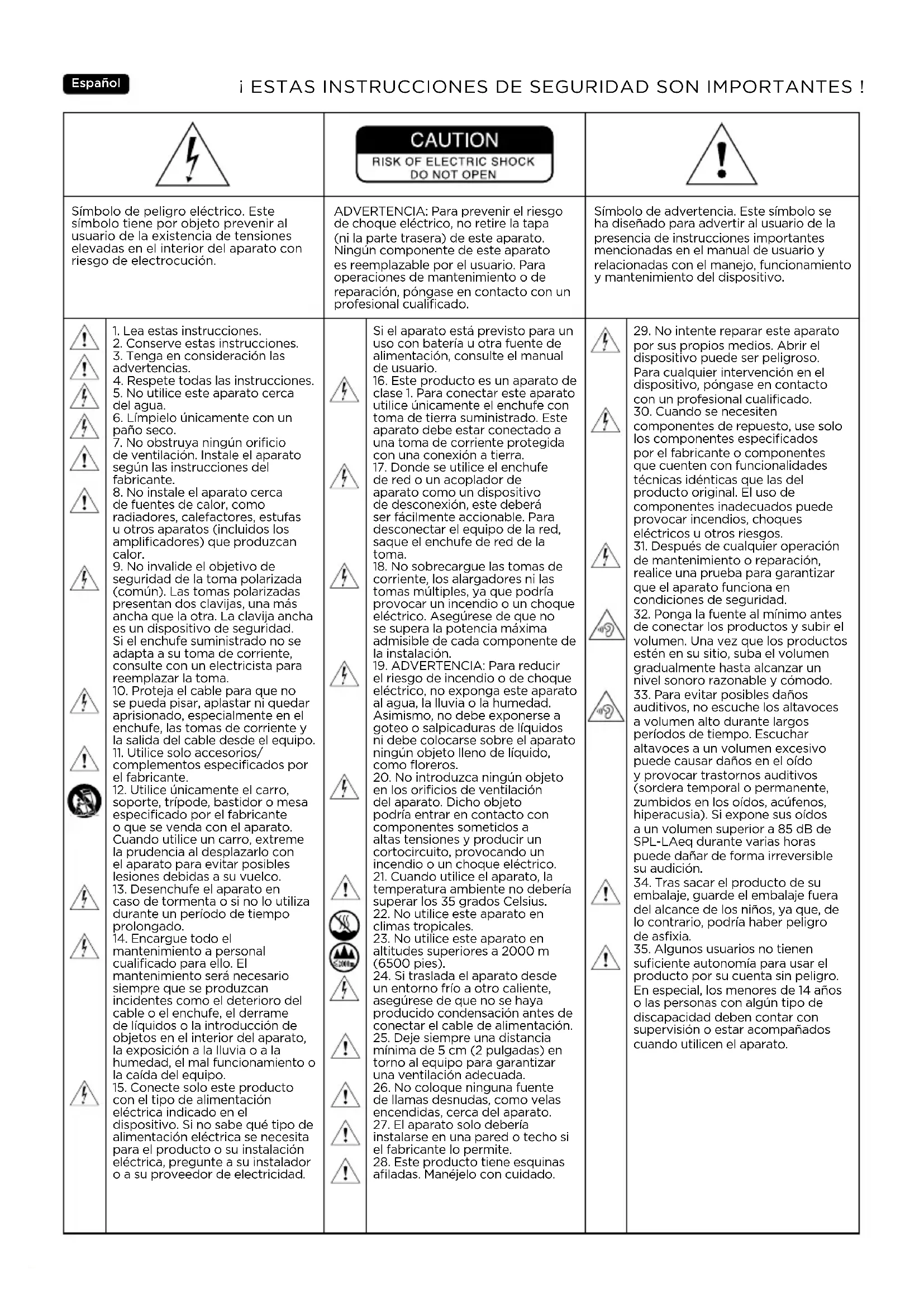 - Range di temperatura In funzione: 5-35°C In stoccaggio: 0-50°CEspañol Símbolo de peligro eléctrico. Este símbolo tiene por objeto prevenir al usuario de la existencia de tensiones elevadas en el interior del aparato con riesgo de electrocución. ADVERTENCIA: Para prevenir el riesgo de choque eléctrico, no retire la tapa (ni la parte trasera) de este aparato. Ningún componente de este aparato es reemplazable por el usuario. Para operaciones de mantenimiento o de reparación, póngase en contacto con un profesional cualificado. Símbolo de advertencia. Este símbolo se ha diseñado para advertir al usuario de la presencia de instrucciones importantes mencionadas en el manual de usuario y relacionadas con el manejo, funcionamiento y mantenimiento del dispositivo.