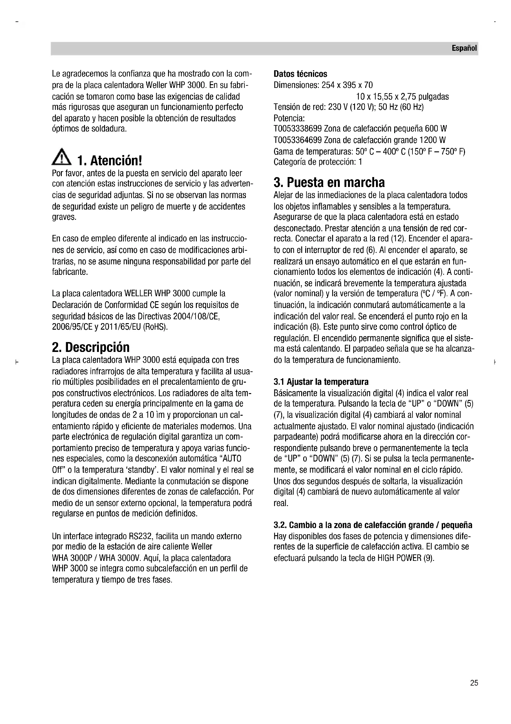 Por favor, antes de la puesta en servicio del aparato leer con atención estas instrucciones de servicio y las adverten- cias de seguridad adjuntas. Si no se observan las normas de seguridad existe un peligro de muerte y de accidentes graves. En caso de empleo diferente al indicado en las instruccio- nes de servicio, así como en caso de modificaciones arbi- trarias, no se asume ninguna responsabilidad por parte del fabricante. La placa calentadora WELLER WHP 3000 cumple la Declaración de Conformidad CE según los requisitos de seguridad básicos de las Directivas 2004/108/CE, 2006/95/CE y 2011/65/EU (RoHS).