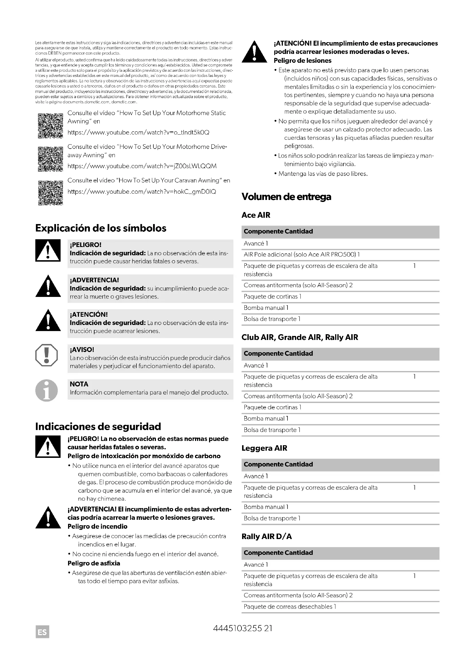 - Mantenga las vías de paso libres. Volumen de entrega Ace AIR Club AIR, Grande AIR, Rally AIR Leggera AIR Rally AIR D/A Consulte el vídeo “How To Set Up Your Motorhome Static Awning” en https://www.youtube.com/watch?v=o_tIndt5k0Q Consulte el vídeo “How To Set Up Your Motorhome Drive- away Awning” en https://www.youtube.com/watch?v=jZ00sLWLQQM Consulte el vídeo “How To Set Up Your Caravan Awning” en https://www.youtube.com/watch?v=hokC_gmD0lQ ¡PELIGRO! Indicación de seguridad: La no observación de esta ins- trucción puede causar heridas fatales o severas. ¡ADVERTENCIA! Indicación de seguridad: su incumplimiento puede aca- rrear la muerte o graves lesiones. ¡ATENCIÓN! Indicación de seguridad: La no observación de esta ins- trucción puede acarrear lesiones. ¡AVISO! La no observación de esta instrucción puede producir daños materiales y perjudicar el funcionamiento del aparato. NOTA Información complementaria para el manejo del producto. Componente Cantidad Avancé 1 AIR Pole adicional (solo Ace AIR PRO500) 1 Paquete de piquetas y correas de escalera de alta resistencia