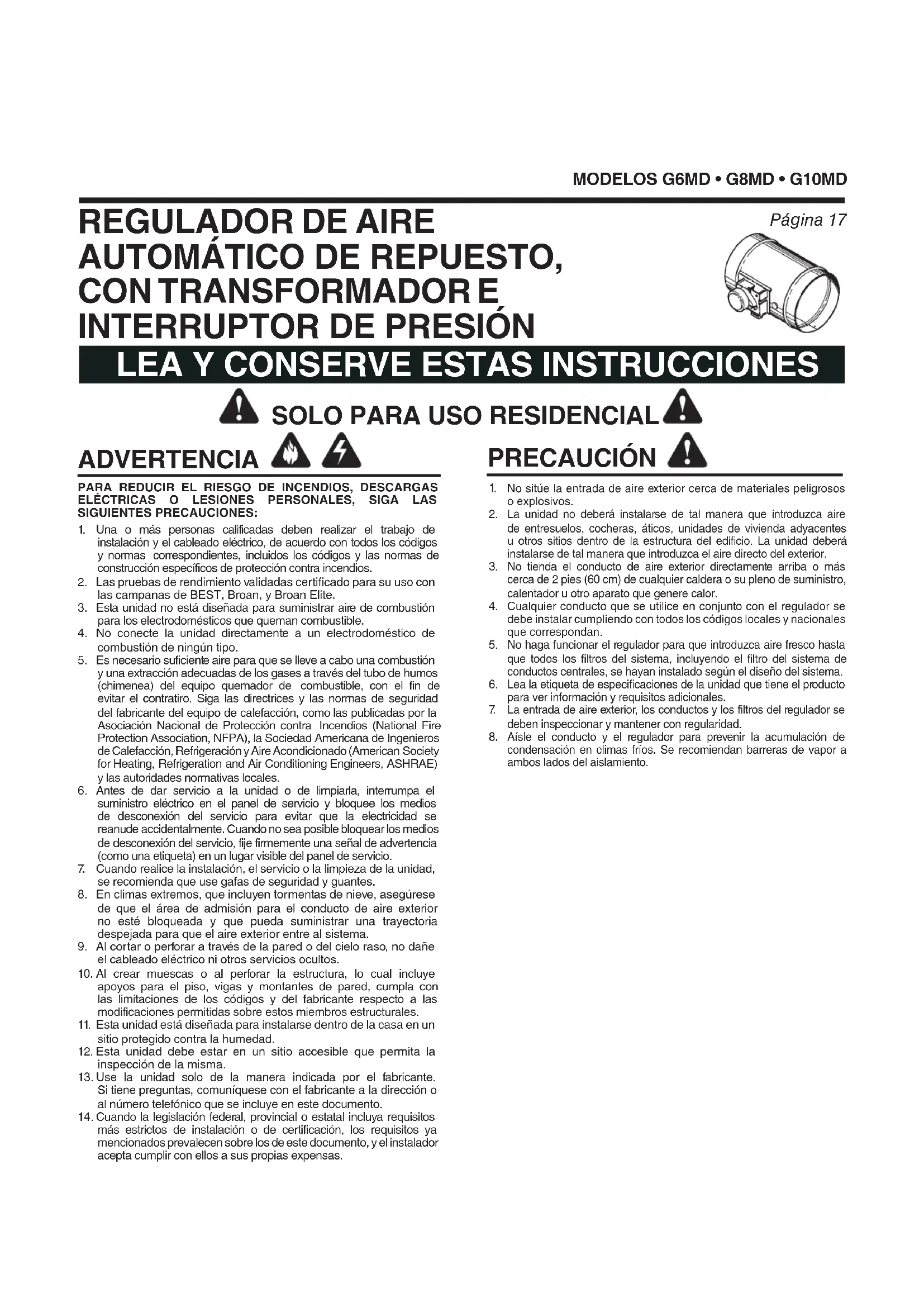 ELPAQUETE - Regulador motorizado - Transformador - Conjunto del interruptor de presión, que incluye: - Interruptor de presión - Sonda - Tubo de PVC de 12 pulg. (30 cm) y ¼ pulg. (6 mm) de D.I. - Empaque - (6) Tornillos para chapa metálica HERRAMIENTAS REQUERIDAS - Dado de ¼ pulg. - Destornillador plano o Phillips - Broca para taladro de 3/8 pulg. - Cinta para conductos - Cable de bajo voltaje (2 conductores) - (2) Terminales con paleta hembra de ¼ de pulg. - Tuercas para cableMODELOS G6MD • G8MD • G10MD Página 19 Regulador conectado con conductos de aire exterior directamente a un cielo raso, piso o registro de pared. MURO INTERIORREGISTRO EN LA PAREDCAJA DE REGISTRO ADAPTADA CON FILTRO DESLIZANTE (opcional)REGULADOR MOTORIZADOMEDICIÓN DE CAMPO DE LA PRESIÓN DEL CONDUCTO DE AIRE EXTERIOR (vea las instrucciones de balanceo del regulador en la sección “Instale el regulador” de la página 20) TAPA DE PARED CON MALLA PARA PÁJAROSCONDUCTO DE AIRE EXTERIOR AISLADO (la pendiente es hacia la tapa de la pared)MURO EXTERIORENTRADA DE AIRE DE VENTILACIÓN (coloque lejos de fuentes de contaminación)