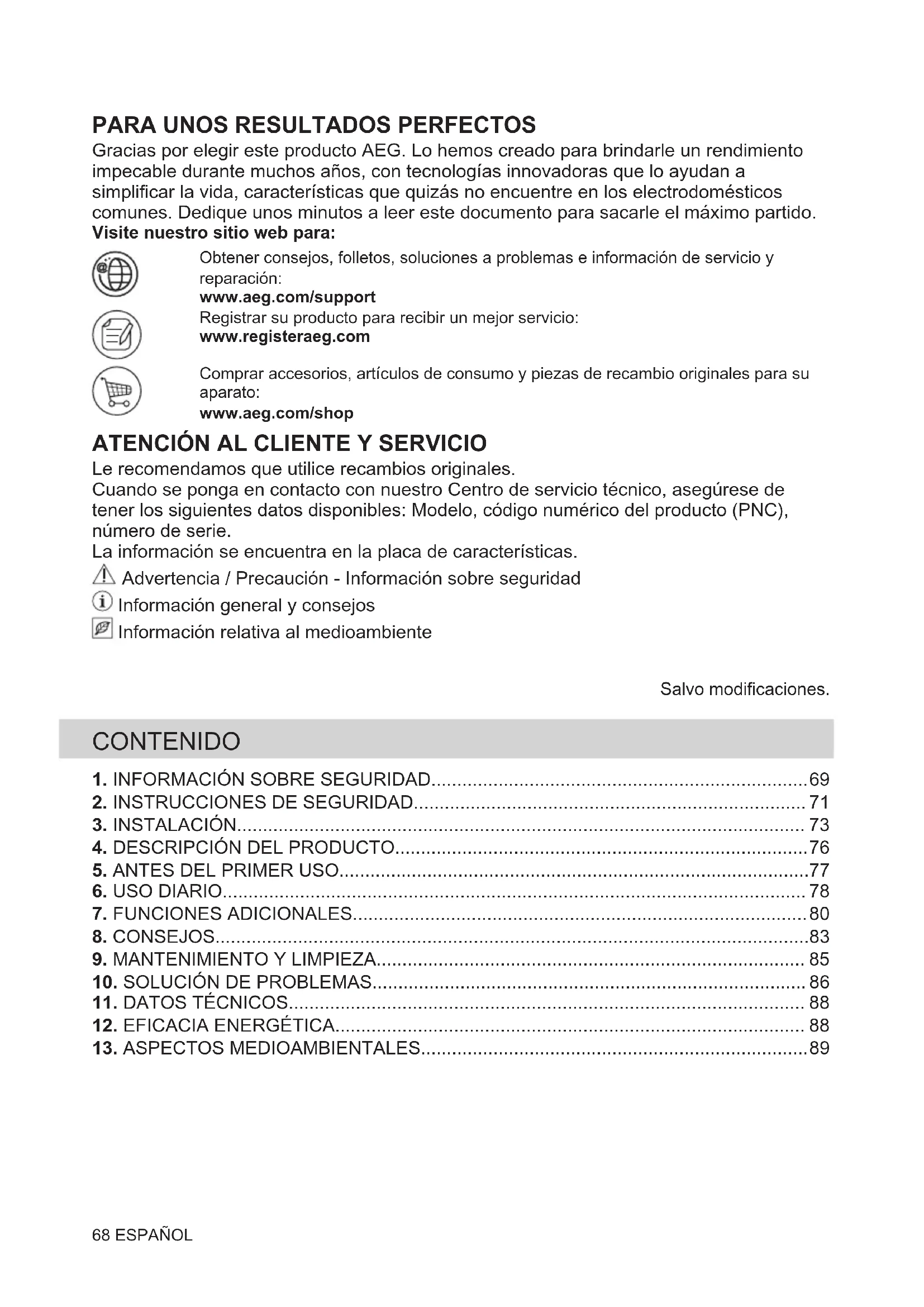 Le recomendamos que utilice recambios originales. Cuando se ponga en contacto con nuestro Centro de servicio técnico, asegúrese de tener los siguientes datos disponibles: Modelo, código numérico del producto (PNC), número de serie. La información se encuentra en la placa de características. Advertencia / Precaución - Información sobre seguridad Información general y consejos Información relativa al medioambiente Salvo modificaciones. CONTENIDO