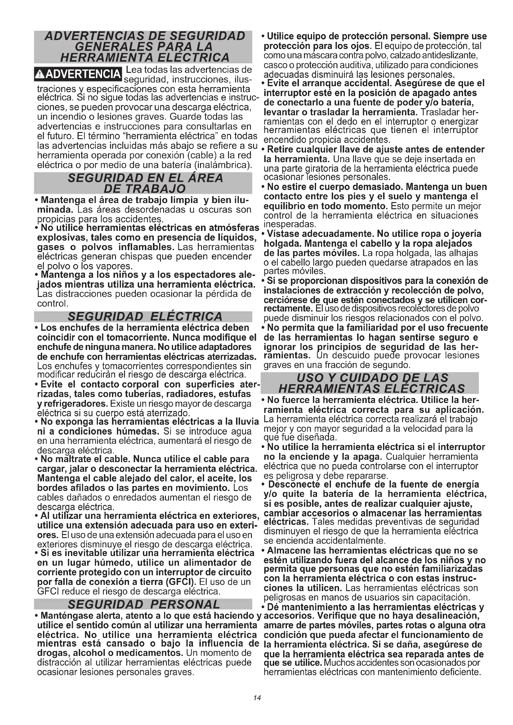 - Dé mantenimiento a las herramientas eléctricas y accesorios. Verique que no haya desalineación, amarre de partes móviles, partes rotas o alguna otra condición que pueda afectar el funcionamiento de la herramienta eléctrica. Si se daña, asegúrese de que la herramienta eléctrica sea reparada antes de que se utilice. Muchos accidentes son ocasionados por herramientas eléctricas con mantenimiento deciente.15