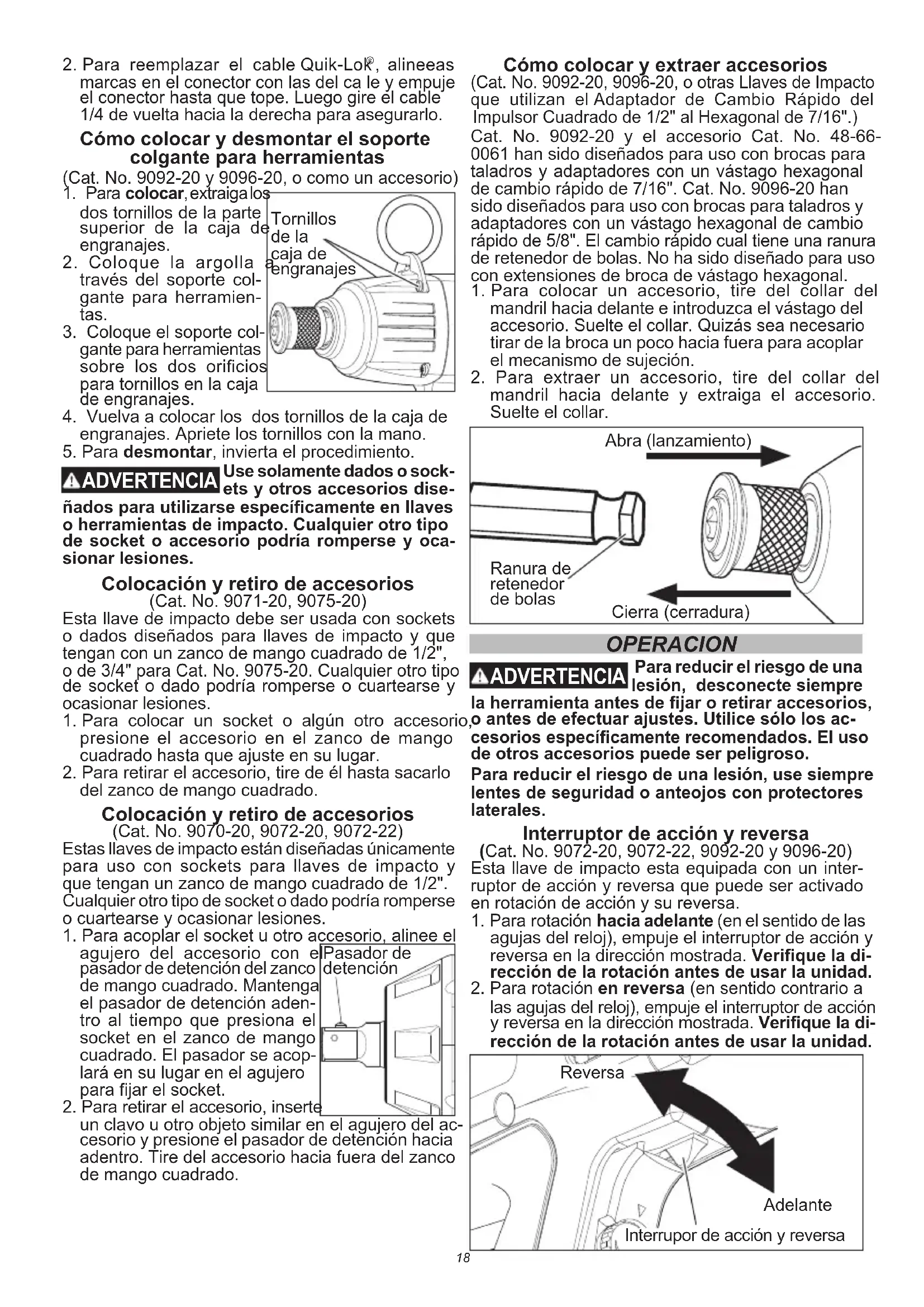 ADVERTENCIA Use solamente dados o sock- ets y otros accesorios dise- ñados para utilizarse especícamente en llaves o herramientas de impacto. Cualquier otro tipo de socket o accesorio podría romperse y oca- sionar lesiones. Colocación y retiro de accesorios (Cat. No. 9071-20, 9075-20) Esta llave de impacto debe ser usada con sockets o dados diseñados para llaves de impacto y que tengan con un zanco de mango cuadrado de 1/2", o de 3/4" para Cat. No. 9075-20. Cualquier otro tipo de socket o dado podría romperse o cuartearse y ocasionar lesiones.