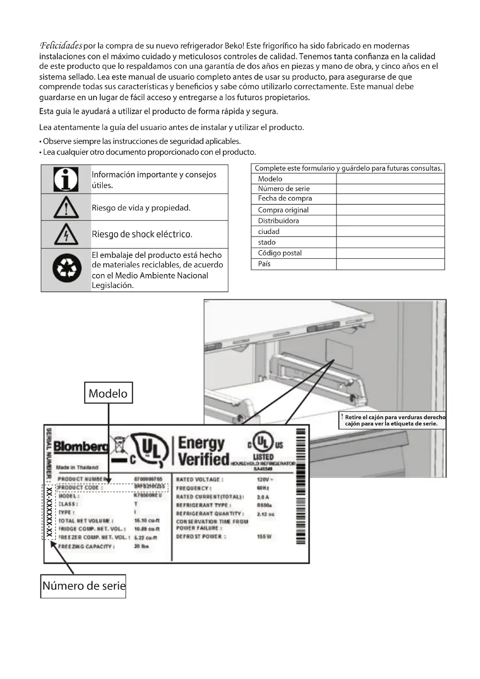 - Lea cualquier otro documento proporcionado con el producto. Información importante y consejos útiles. El embalaje del producto está hecho de materiales reciclables, de acuerdo con el Medio Ambiente Nacional Legislación. Número de serie Modelo Riesgo de vida y propiedad. Riesgo de shock eléctrico. Esta guía le ayudará a utilizar el producto de forma rápida y segura. Lea atentamente la guía del usuario antes de instalar y utilizar el producto. Complete este formulario y guárdelo para futuras consultas. Modelo Número de serie Fecha de compra Compra original Distribuidora ciudad stado Código postal País XX-XXXXXX-XX Retire el cajón para verduras derechocajón para ver la etiqueta de serie.Contenido ¡Lea primero la sección "Instrucciones de seguridad"! El fabricante no será responsable de ningún evento causado por no tener en cuenta la información proporcionada en este manual de usuario.