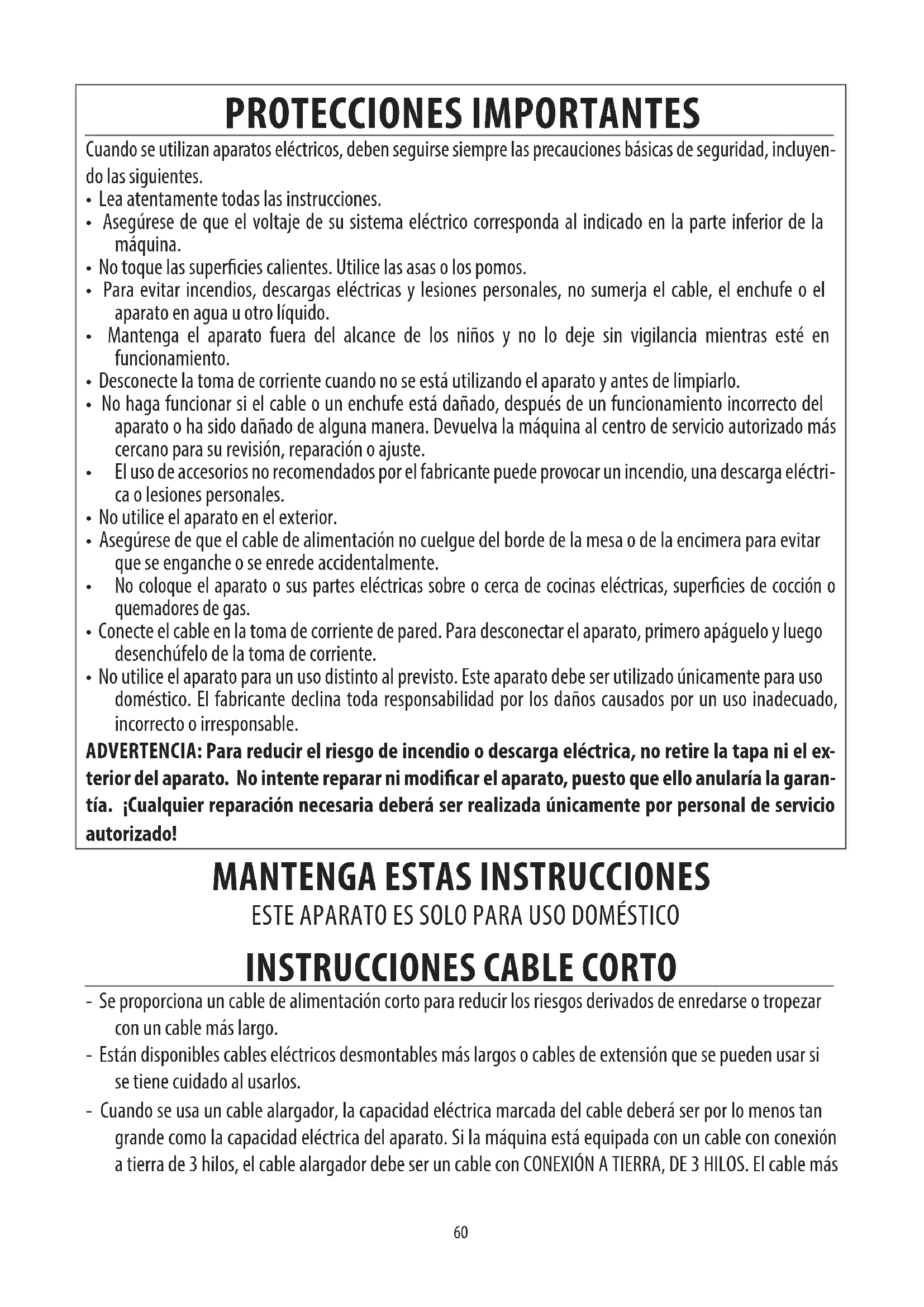 - Se proporciona un cable de alimentación corto para reducir los riesgos derivados de enredarse o tropezar con un cable más largo. - Están disponibles cables eléctricos desmontables más largos o cables de extensión que se pueden usar si se tiene cuidado al usarlos. - Cuando se usa un cable alargador, la capacidad eléctrica marcada del cable deberá ser por lo menos tan grande como la capacidad eléctrica del aparato. Si la máquina está equipada con un cable con conexión a tierra de 3 hilos, el cable alargador debe ser un cable con CONEXIÓN A TIERRA, DE 3 HILOS. El cable más61