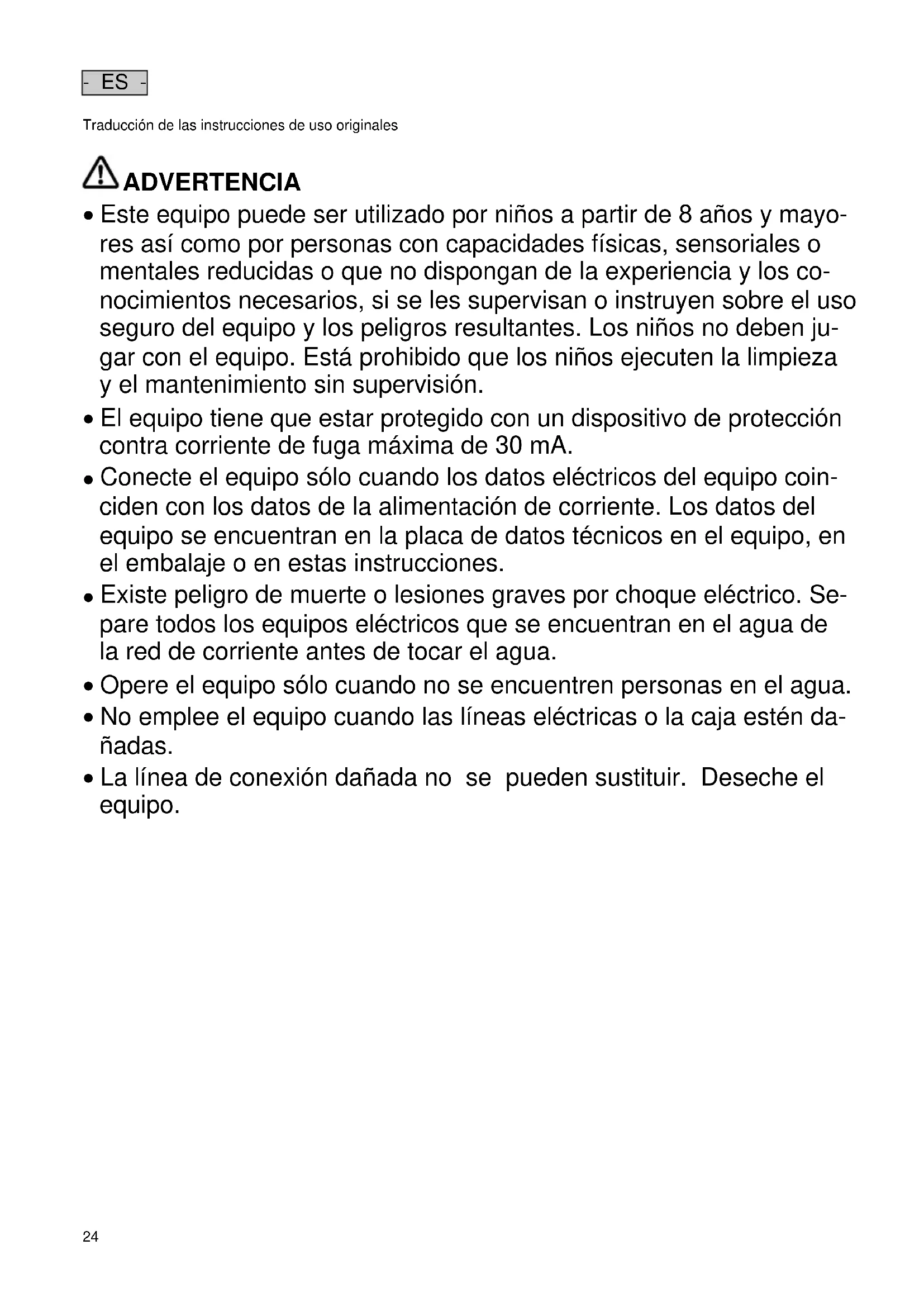 Este equipo puede ser utilizado por niños a partir de 8 años y mayo- res así como por personas con capacidades físicas, sensoriales o mentales reducidas o que no dispongan de la experiencia y los co- nocimientos necesarios, si se les supervisan o instruyen sobre el uso seguro del equipo y los peligros resultantes. Los niños no deben ju- gar con el equipo. Está prohibido que los niños ejecuten la limpieza y el mantenimiento sin supervisión.