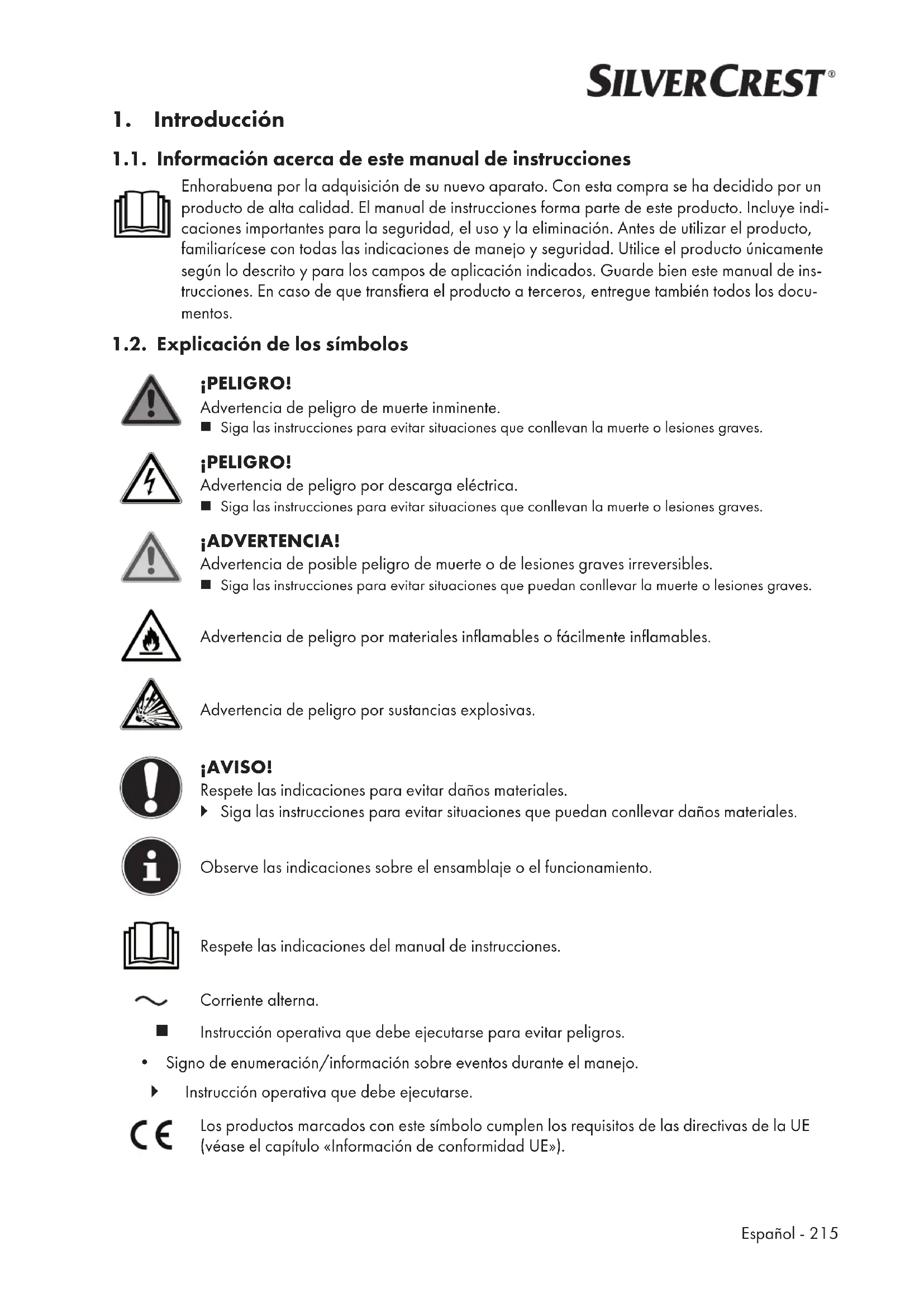 1.1. Información acerca de este manual de instrucciones Enhorabuena por la adquisición de su nuevo aparato. Con esta compra se ha decidido por un producto de alta calidad. El manual de instrucciones forma parte de este producto. Incluye indi- caciones importantes para la seguridad, el uso y la eliminación. Antes de utilizar el producto, familiarícese con todas las indicaciones de manejo y seguridad. Utilice el producto únicamente según lo descrito y para los campos de aplicación indicados. Guarde bien este manual de ins- trucciones. En caso de que transfiera el producto a terceros, entregue también todos los docu- mentos. 1.2. Explicación de los símbolos ¡PELIGRO! Advertencia de peligro de muerte inminente. Siga las instrucciones para evitar situaciones que conllevan la muerte o lesiones graves. ¡PELIGRO! Advertencia de peligro por descarga eléctrica. Siga las instrucciones para evitar situaciones que conllevan la muerte o lesiones graves. ¡ADVERTENCIA! Advertencia de posible peligro de muerte o de lesiones graves irreversibles. Siga las instrucciones para evitar situaciones que puedan conllevar la muerte o lesiones graves. Advertencia de peligro por materiales inflamables o fácilmente inflamables. Advertencia de peligro por sustancias explosivas. ¡AVISO! Respete las indicaciones para evitar daños materiales. Siga las instrucciones para evitar situaciones que puedan conllevar daños materiales. Observe las indicaciones sobre el ensamblaje o el funcionamiento. Respete las indicaciones del manual de instrucciones. Corriente alterna.