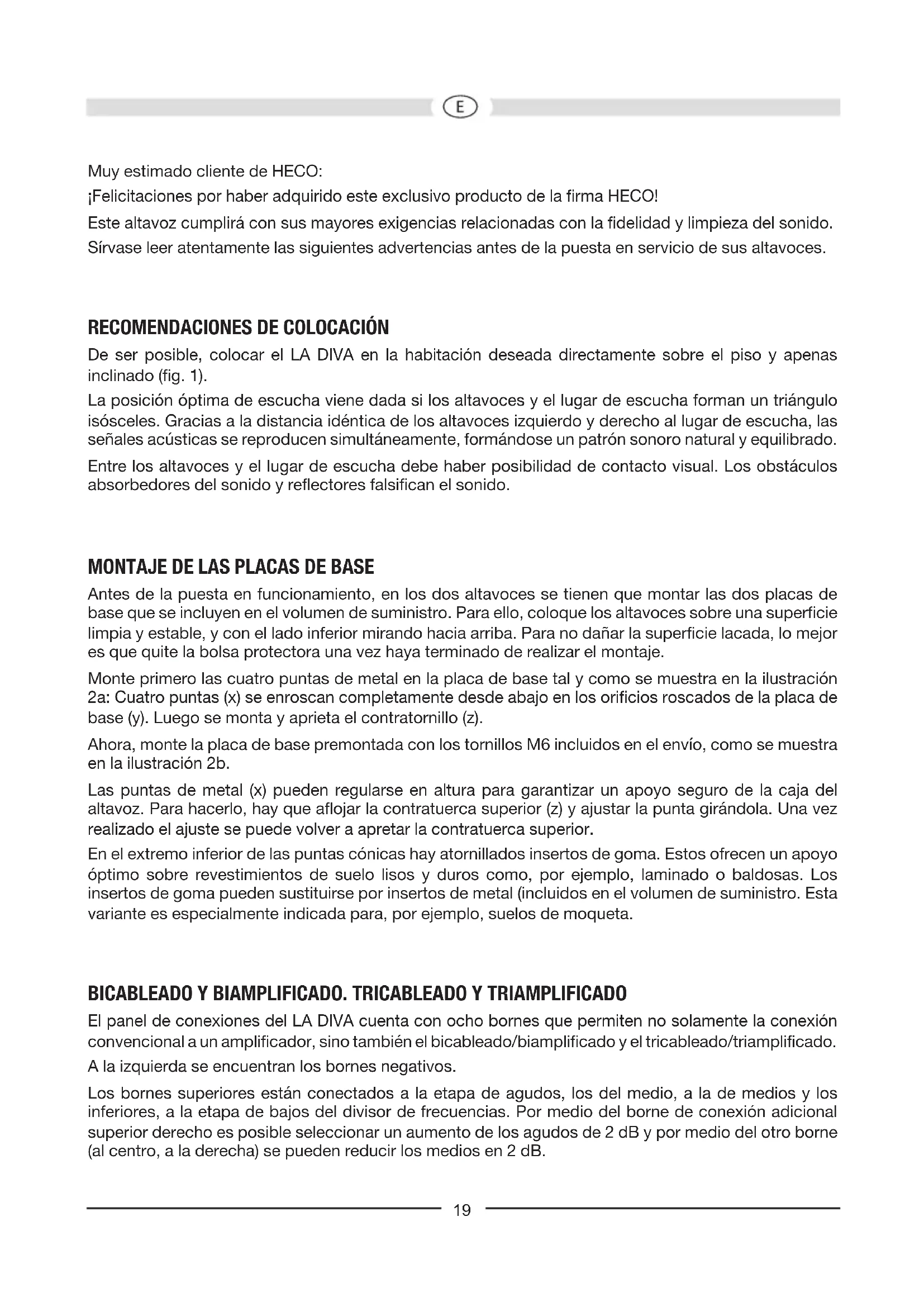 El panel de conexiones del LA DIVA cuenta con ocho bornes que permiten no solamente la conexión convencional a un amplificador, sino también el bicableado/biamplificado y el tricableado/triamplificado. A la izquierda se encuentran los bornes negativos. Los bornes superiores están conectados a la etapa de agudos, los del medio, a la de medios y los inferiores, a la etapa de bajos del divisor de frecuencias. Por medio del borne de conexión adicional superior derecho es posible seleccionar un aumento de los agudos de 2 dB y por medio del otro borne (al centro, a la derecha) se pueden reducir los medios en 2 dB.20 El ajuste adecuado depende de la habitación, la ubicación de los altavoces y, por supuesto, del gusto personal. En habitaciones con grandes muebles tapizados o cortinas, se recomienda ajustar los agudos en +2dB; si el equipo se coloca próximo a la pared y en la habitación no hay dichos muebles o cortinas, se recomienda ajustar los tonos medios en -2dB. Mediante el bicableado las frecuencias agudas y bajas son transportadas por vías separadas. El bicableado requiere, además del segundo cable, un segundo amplificador adicional.El tricableado requiere de un tercer cable y el triamplificado, de un tercer amplificador adicional. El equipo se entrega con los accesorios necesarios para configurar hasta 4 puentes. Se recomienda utilizar los bornes del altavoz de funcionamiento convencional con los puentes Y (1 terminal y 2 fichas banana) como se muestra en las figuras 3a a 2d. Para el bicableado y biamplificado, utilizar los otros puentes (1 terminal y 1 ficha banana) como se muestra en las figuras 3e a 2l. Para el tricableado y triamplificado no se deben montar puentes. La conexión al amplificador (o amplificadores) se muestra en las figuras 3m a 2t. CONEXIÓN DE SUS ALTAVOCES HECO LA DIVA Advertencia: conecte al terminal del altavoz LA DIVA solamente conexiones de salida de amplificadores de alta fidelidad. Para la conexión de los altavoces necesita cables especiales para altavoces obtenibles en el comercio especializado. Para evitar pérdida de sonido, conviene utilizar longitudes de cable hasta 3 m con una sección de cable mínima de 2,5 mm², en las longitudes mayores por lo menos 4 mm². El amplificador o bien el receptor en principio debe estar desconectado hasta que se hayan establecido todas las conexiones. Los altavoces deben hallarse, a fin de poder medir las longitudes de cable correctas, en sus posiciones previstas. Para ambos canales debe emplearse la misma longitud de cable. Es imprescindible, en la conexión de los cables, prestar atención a la polaridad correcta, es decir que los bornes negros (-) de los altavoces deben unirse a los bornes (-) del amplificador y los bornes rojos (+) de los altavoces a los bornes (+) del amplificador. En los cables de altavoz corrientes en el comercio y para facilitar la conexión con fases correctas, hay un conductor de cable estriado, mientras que el otro está marcado por una tira de color. El terminal LA DIVA está diseñado para 3 tipos de cables: