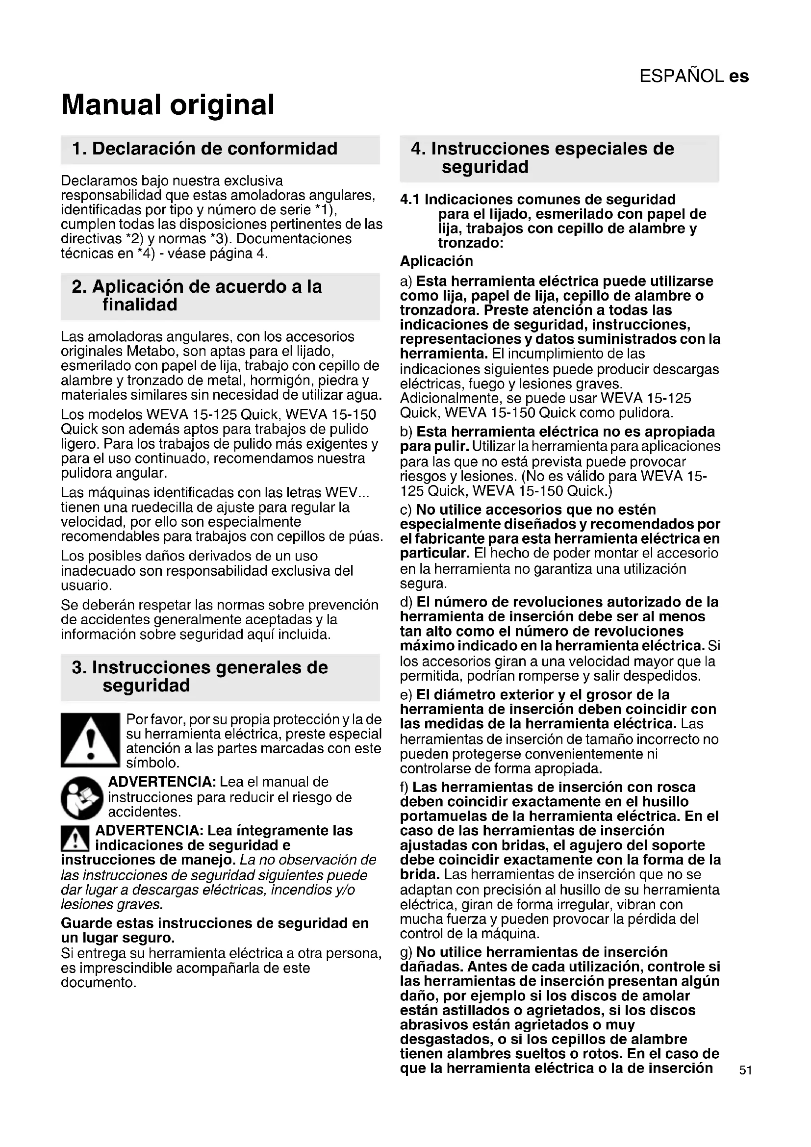 Manual original Declaramos bajo nuestra exclusiva responsabilidad que estas amoladoras angulares, identificadas por tipo y número de serie *1), cumplen todas las disposiciones pertinentes de las directivas *2) y normas *3). Documentaciones técnicas en *4) - véase página 4. Las amoladoras angulares, con los accesorios originales Metabo, son aptas para el lijado, esmerilado con papel de lija, trabajo con cepillo de alambre y tronzado de metal, hormigón, piedra y materiales similares sin necesidad de utilizar agua. Los modelos WEVA 15-125 Quick, WEVA 15-150 Quick son además aptos para trabajos de pulido ligero. Para los trabajos de pulido más exigentes y para el uso continuado, recomendamos nuestra pulidora angular. Las máquinas identificadas con las letras WEV... tienen una ruedecilla de ajuste para regular la velocidad, por ello son especialmente recomendables para trabajos con cepillos de púas. Los posibles daños derivados de un uso inadecuado son responsabilidad exclusiva del usuario. Se deberán respetar las normas sobre prevención de accidentes generalmente aceptadas y la información sobre seguridad aquí incluida. Por favor, por su propia protección y la de su herramienta eléctrica, preste especial atención a las partes marcadas con este símbolo. ADVERTENCIA: Lea el manual de instrucciones para reducir el riesgo de accidentes. ADVERTENCIA: Lea íntegramente las indicaciones de seguridad e instrucciones de manejo. La no observación de las instrucciones de seguridad siguientes puede dar lugar a descargas eléctricas, incendios y/o lesiones graves. Guarde estas instrucciones de seguridad en un lugar seguro. Si entrega su herramienta eléctrica a otra persona, es imprescindible acompañarla de este documento.