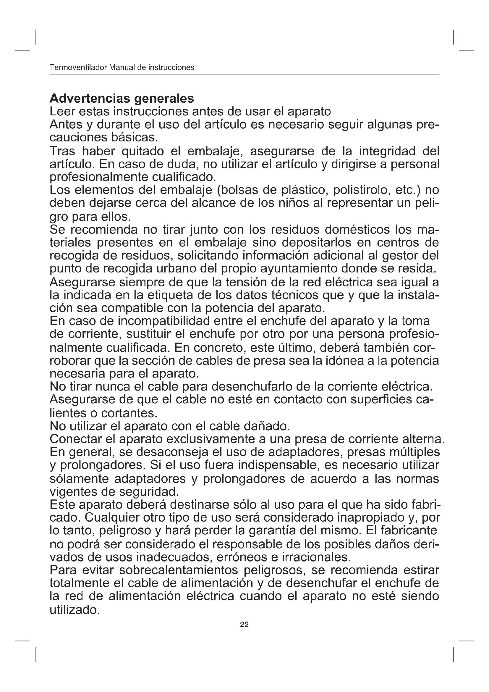 Advertencias generales Leer estas instrucciones antes de usar el aparato Antes y durante el uso del artículo es necesario seguir algunas pre- cauciones básicas. Tras haber quitado el embalaje, asegurarse de la integridad del artículo. En caso de duda, no utilizar el artículo y dirigirse a personal profesionalmente cualicado. Los elementos del embalaje (bolsas de plástico, polistirolo, etc.) no deben dejarse cerca del alcance de los niños al representar un peli- gro para ellos. Se recomienda no tirar junto con los residuos domésticos los ma- teriales presentes en el embalaje sino depositarlos en centros de recogida de residuos, solicitando información adicional al gestor del punto de recogida urbano del propio ayuntamiento donde se resida. Asegurarse siempre de que la tensión de la red eléctrica sea igual a la indicada en la etiqueta de los datos técnicos que y que la instala- ción sea compatible con la potencia del aparato. En caso de incompatibilidad entre el enchufe del aparato y la toma de corriente, sustituir el enchufe por otro por una persona profesio- nalmente cualicada. En concreto, este último, deberá también cor- roborar que la sección de cables de presa sea la idónea a la potencia necesaria para el aparato. No tirar nunca el cable para desenchufarlo de la corriente eléctrica. Asegurarse de que el cable no esté en contacto con supercies ca- lientes o cortantes. No utilizar el aparato con el cable dañado. Conectar el aparato exclusivamente a una presa de corriente alterna. En general, se desaconseja el uso de adaptadores, presas múltiples y prolongadores. Si el uso fuera indispensable, es necesario utilizar sólamente adaptadores y prolongadores de acuerdo a las normas vigentes de seguridad. Este aparato deberá destinarse sólo al uso para el que ha sido fabri- cado. Cualquier otro tipo de uso será considerado inapropiado y, por lo tanto, peligroso y hará perder la garantía del mismo. El fabricante no podrá ser considerado el responsable de los posibles daños deri- vados de usos inadecuados, erróneos e irracionales. Para evitar sobrecalentamientos peligrosos, se recomienda estirar totalmente el cable de alimentación y de desenchufar el enchufe de la red de alimentación eléctrica cuando el aparato no esté siendo utilizado.Termoventilador Manual de instrucciones
