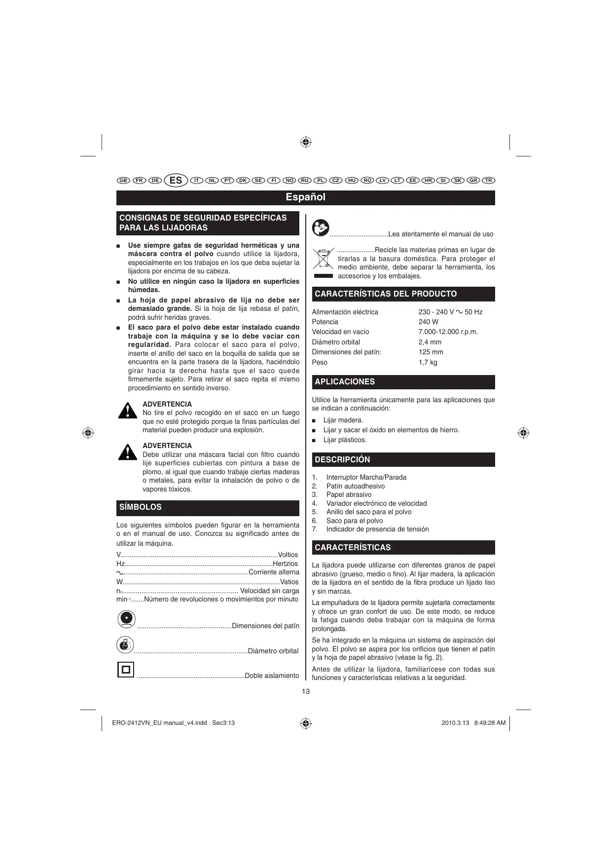 SÍMBOLOS Los siguientes símbolos pueden figurar en la herramienta o en el manual de uso. Conozca su significado antes de utilizar la máquina. Interruptor Marcha/Parada Patín autoadhesivo Papel abrasivo Variador electrónico de velocidad Anillo del saco para el polvo Saco para el polvo Indicador de presencia de tensión CARACTERÍSTICAS La lijadora puede utilizarse con diferentes granos de papel abrasivo (grueso, medio o fino). Al lijar madera, la aplicación de la lijadora en el sentido de la fibra produce un lijado liso y sin marcas. La empuñadura de la lijadora permite sujetarla correctamente y ofrece un gran confort de uso. De este modo, se reduce la fatiga cuando deba trabajar con la máquina de forma prolongada. Se ha integrado en la máquina un sistema de aspiración del polvo. El polvo se aspira por los orificios que tienen el patín y la hoja de papel abrasivo (véase la fig. 2). .........................................................Doble aislamiento Antes de utilizar la lijadora, familiarícese con todas sus funciones y características relativas a la seguridad.