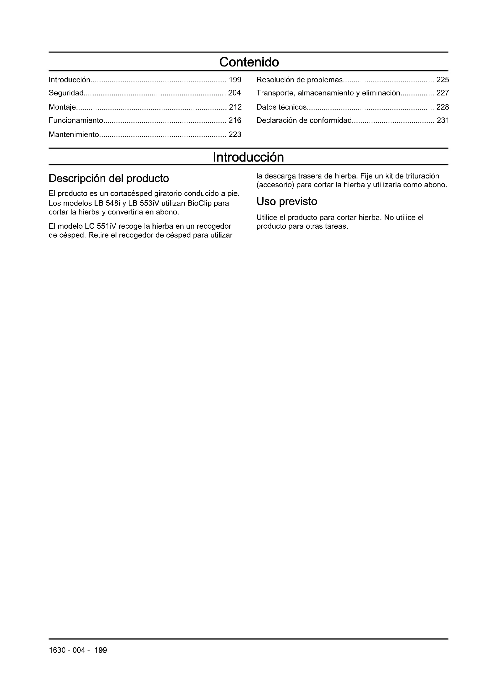 - Declaración de conformidad Introducción Descripción del producto El producto es un cortacésped giratorio conducido a pie. Los modelos LB 548i y LB553iV utilizan BioClip para cortar la hierba y convertirla en abono. El modelo LC551iV recoge la hierba en un recogedor de césped. Retire el recogedor de césped para utilizar la descarga trasera de hierba. Fije un kit de trituración (accesorio) para cortar la hierba y utilizarla como abono. Uso previsto Utilice el producto para cortar hierba. No utilice el producto para otras tareas. 1630 - 004 - 199Descripción del producto (LB548i, LC551iV) LB 548i LC 551iV p. 231