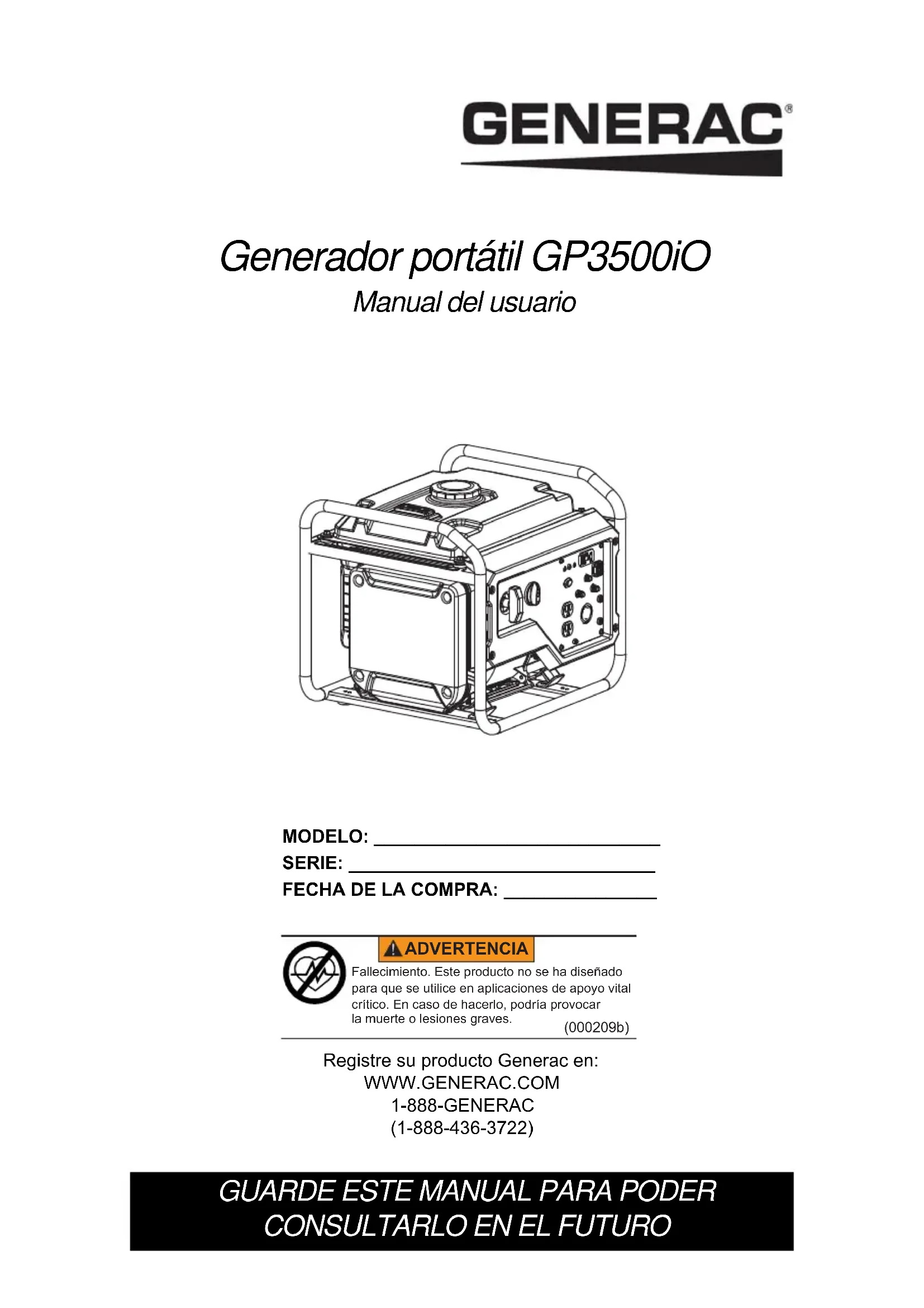 (000209b) Fallecimiento. Este producto no se ha diseñado para que se utilice en aplicaciones de apoyo vital crítico. En caso de hacerlo, podría provocar la muerte o lesiones graves. ADVERTENCIA Registre su producto Generac en: