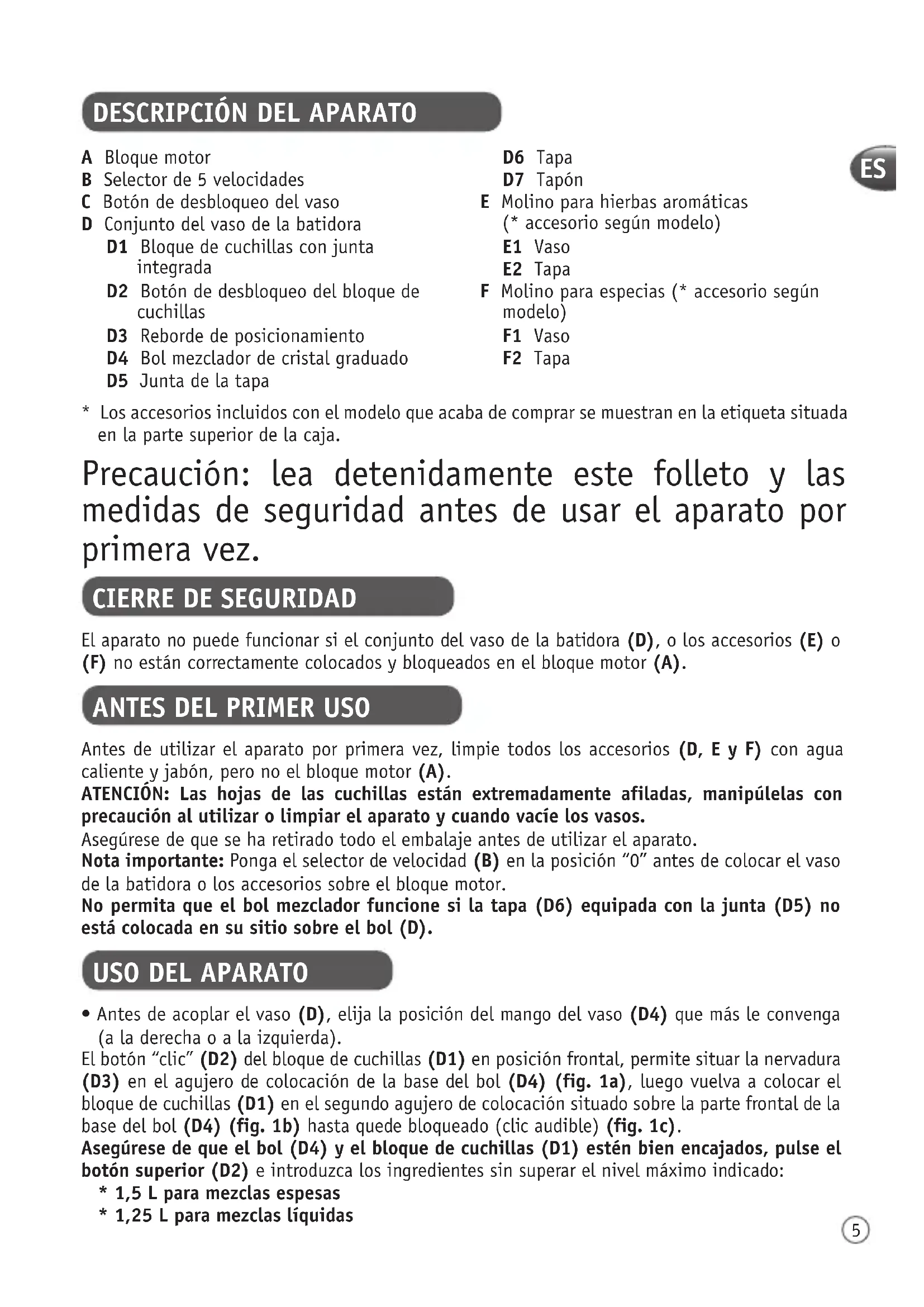 - Los accesorios incluidos con el modelo que acaba de comprar se muestran en la etiqueta situada en la parte superior de la caja. El aparato no puede funcionar si el conjunto del vaso de la batidora (D), o los accesorios (E) o (F) no están correctamente colocados y bloqueados en el bloque motor (A). Precaución: lea detenidamente este folleto y las medidas de seguridad antes de usar el aparato por primera vez. Antes de utilizar el aparato por primera vez, limpie todos los accesorios (D, E y F) con agua caliente y jabón, pero no el bloque motor (A). ATENCIÓN: Las hojas de las cuchillas están extremadamente afiladas, manipúlelas con precaución al utilizar o limpiar el aparato y cuando vacíe los vasos. Asegúrese de que se ha retirado todo el embalaje antes de utilizar el aparato. Nota importante: Ponga el selector de velocidad (B) en la posición “0” antes de colocar el vaso de la batidora o los accesorios sobre el bloque motor. No permita que el bol mezclador funcione si la tapa (D6) equipada con la junta (D5) no está colocada en su sitio sobre el bol (D).