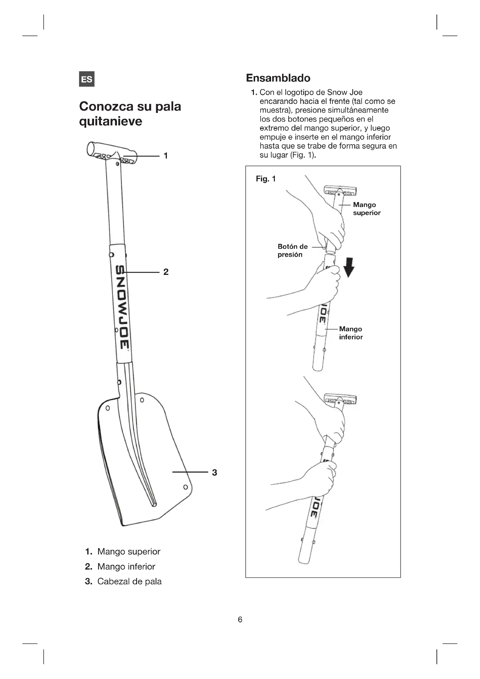 Ensamblado 1. Con el logotipo de Snow Joe encarando hacia el frente (tal como se muestra), presione simultáneamente los dos botones pequeños en el extremo del mango superior, y luego empuje e inserte en el mango inferior hasta que se trabe de forma segura en su lugar (Fig. 1).