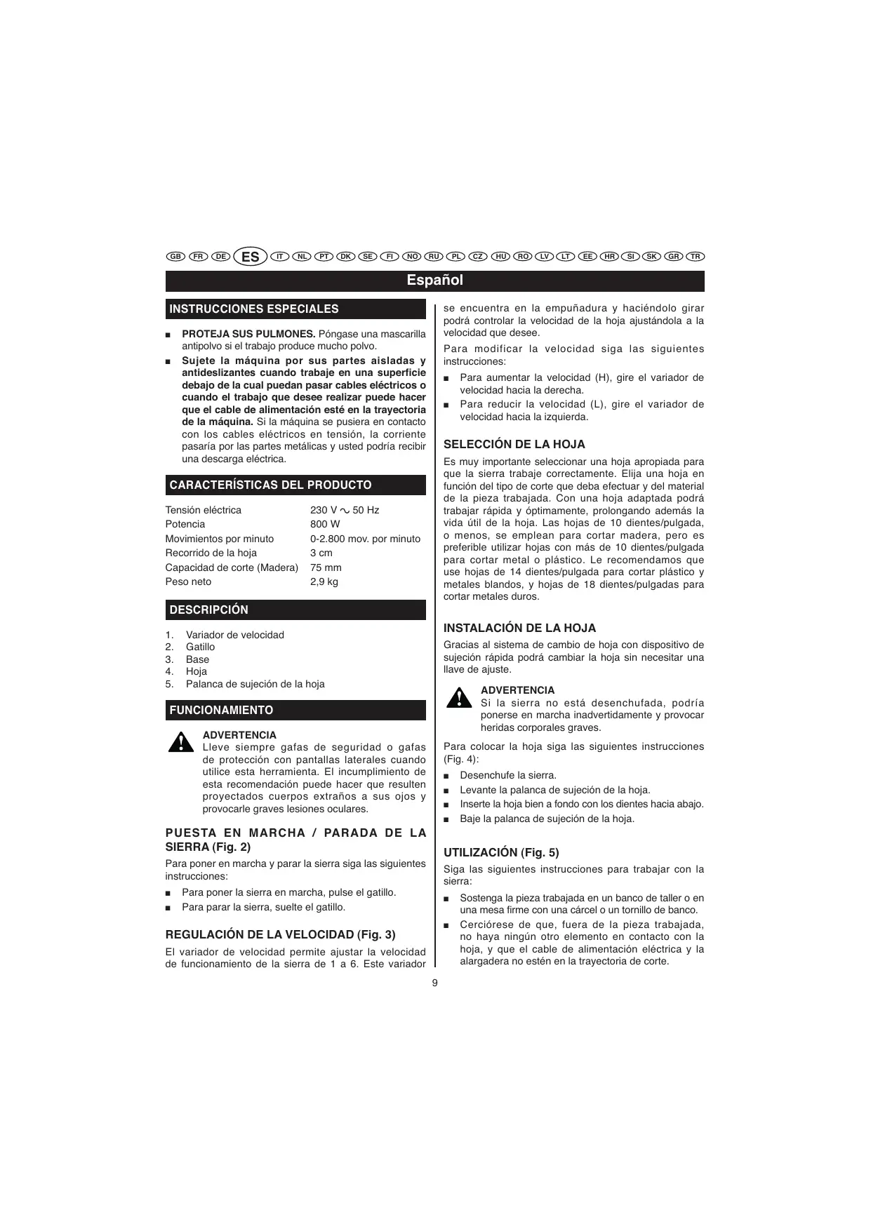 Es imprescindible que lea las instrucciones de este manual antes del montaje y de la puesta en servicio. Attenzione! Español se encuentra en la empuñadura y haciéndolo girar podrá controlar la velocidad de la hoja ajustándola a la velocidad que desee. INSTRUCCIONES ESPECIALES