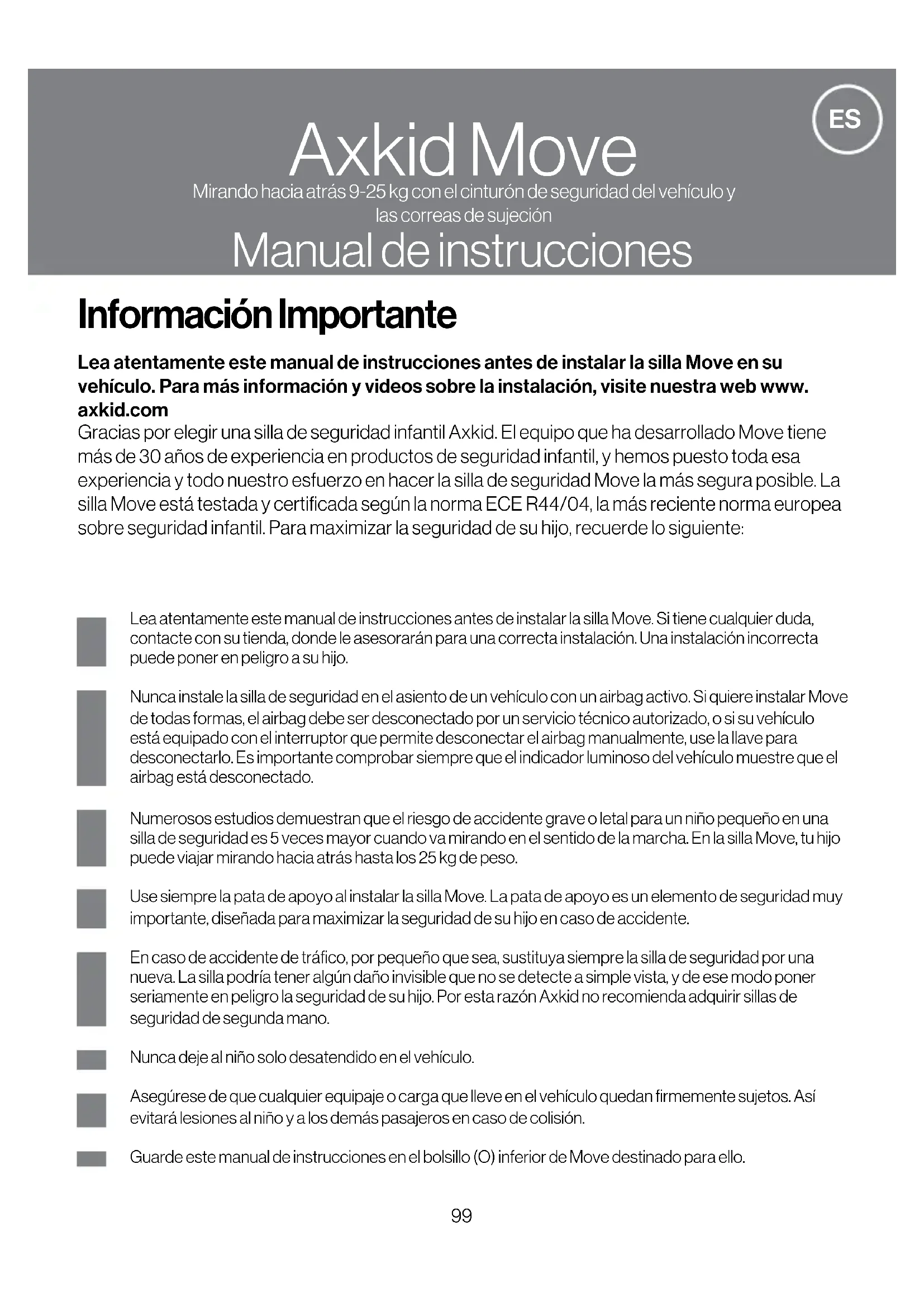 Manual de instrucciones Mirando hacia atrás 9-25 kg con el cinturón de seguridad del vehículo y las correas de sujeción Lea atentamente este manual de instrucciones antes de instalar la silla Move. Si tiene cualquier duda, contacte con su tienda, donde le asesorarán para una correcta instalación. Una instalación incorrecta puede poner en peligro a su hijo.Nunca instale la silla de seguridad en el asiento de un vehículo con un airbag activo. Si quiere instalar Move de todas formas, el airbag debe ser desconectado por un servicio técnico autorizado, o si su vehículo está equipado con el interruptor que permite desconectar el airbag manualmente, use la llave para desconectarlo. Es importante comprobar siempre que el indicador luminoso del vehículo muestre que el airbag está desconectado.Numerosos estudios demuestran que el riesgo de accidente grave o letal para un niño pequeño en una silla de seguridad es 5 veces mayor cuando va mirando en el sentido de la marcha. En la silla Move, tu hijo puede viajar mirando hacia atrás hasta los 25 kg de peso.Use siempre la pata de apoyo al instalar la silla Move. La pata de apoyo es un elemento de seguridad muy importante, diseñada para maximizar la seguridad de su hijo en caso de accidente.En caso de accidente de tráfico, por pequeño que sea, sustituya siempre la silla de seguridad por una nueva. La silla podría tener algún daño invisible que no se detecte a simple vista, y de ese modo poner seriamente en peligro la seguridad de su hijo. Por esta razón Axkid no recomienda adquirir sillas de seguridad de segunda mano.Nunca deje al niño solo desatendido en el vehículo.Asegúrese de que cualquier equipaje o carga que lleve en el vehículo quedan firmemente sujetos. Así evitará lesiones al niño y a los demás pasajeros en caso de colisión.Guarde este manual de instrucciones en el bolsillo (O) inferior de Move destinado para ello. Lea atentamente este manual de instrucciones antes de instalar la silla Move en su vehículo. Para más información y videos sobre la instalación, visite nuestra web www. axkid.com Gracias por elegir una silla de seguridad infantil Axkid. El equipo que ha desarrollado Move tiene más de 30 años de experiencia en productos de seguridad infantil, y hemos puesto toda esa experiencia y todo nuestro esfuerzo en hacer la silla de seguridad Move la más segura posible. La silla Move está testada y certificada según la norma ECE R44/04, la más reciente norma europea sobre seguridad infantil. Para maximizar la seguridad de su hijo, recuerde lo siguiente: Información Importante Axkid Move100 Partes 100 Instalación correcta e incorrecta de la silla de seguridad 100-101 Mirando hacia atrás 9-25 kg con el cinturón de seguridad del vehículo y las correas de sujeción Esta instalación puede hacerse cuando el niño pesa entre 9 y 25 kg. 101-105 Cómo quitar y poner las fundas 105 Cuidado y mantenimiento 105 Garantía 106 La silla de seguridad Move puede usarse en cualquier asiento del vehículo que mire hacia delante y que tenga cinturón de seguridad de tres puntos (i), siempre que el airbag esté desactivado. No usar nunca Move con un cinturón de seguridad de dos puntos (ii). IMPORTANTE: Si desea instalar Move en un asiento con airbag, el airbag debe ser desconectado por un servicio técnico autorizado. Algunos vehículos están equipados con un interruptor que permite desconectar el airbag manualmente. Es importante comprobar siempre que el indicador luminoso del vehículo muestre que el airbag está desconectado. ADVERTENCIA: No instale nunca Move en un asiento del vehículo con el airbag activado ADVERTENCIA: No instale nunca Move en asientos que estén mirando en sentido contrario o de lado ADVERTENCIA: Los airbags están diseñados para los adultos, y pueden lesionar gravemente al niño en caso de accidente Partes