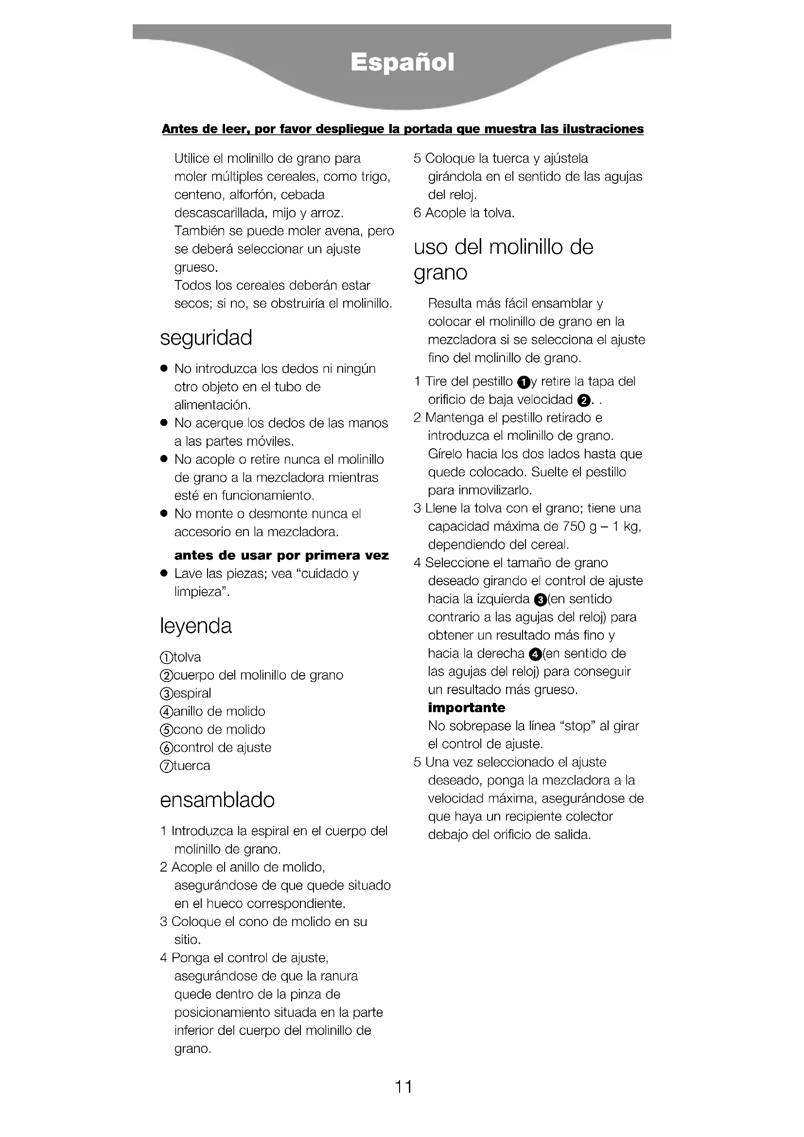 No acople o retire nunca el molinillo de grano a la mezcladora mientras esté en funcionamiento.