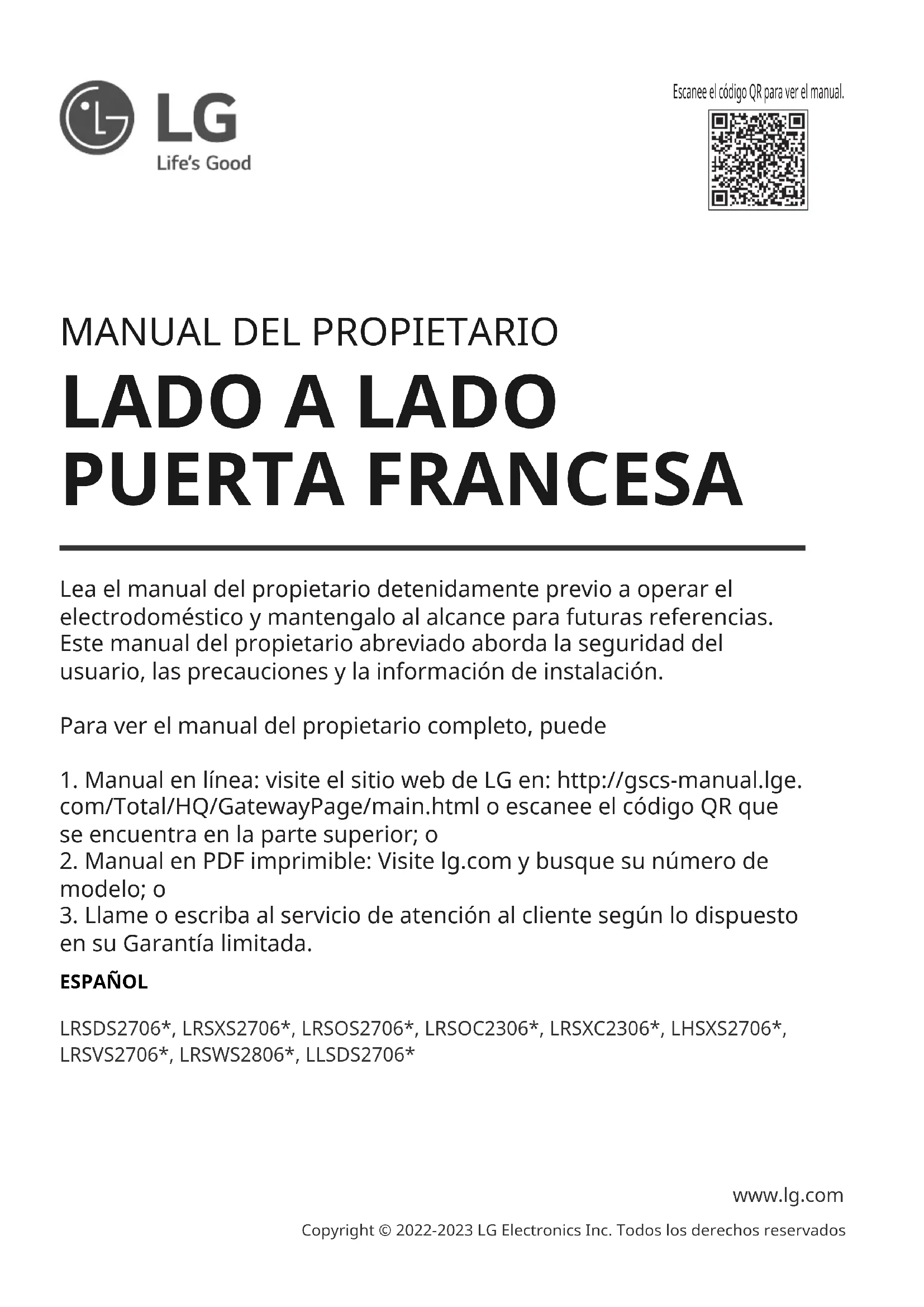 www.lg.com Copyright © 2022-2023 LG Electronics Inc. Todos los derechos reservados Escanee el código QR para ver el manual. Lea el manual del propietario detenidamente previo a operar el electrodoméstico y mantengalo al alcance para futuras referencias. Este manual del propietario abreviado aborda la seguridad del usuario, las precauciones y la información de instalación. Para ver el manual del propietario completo, puede