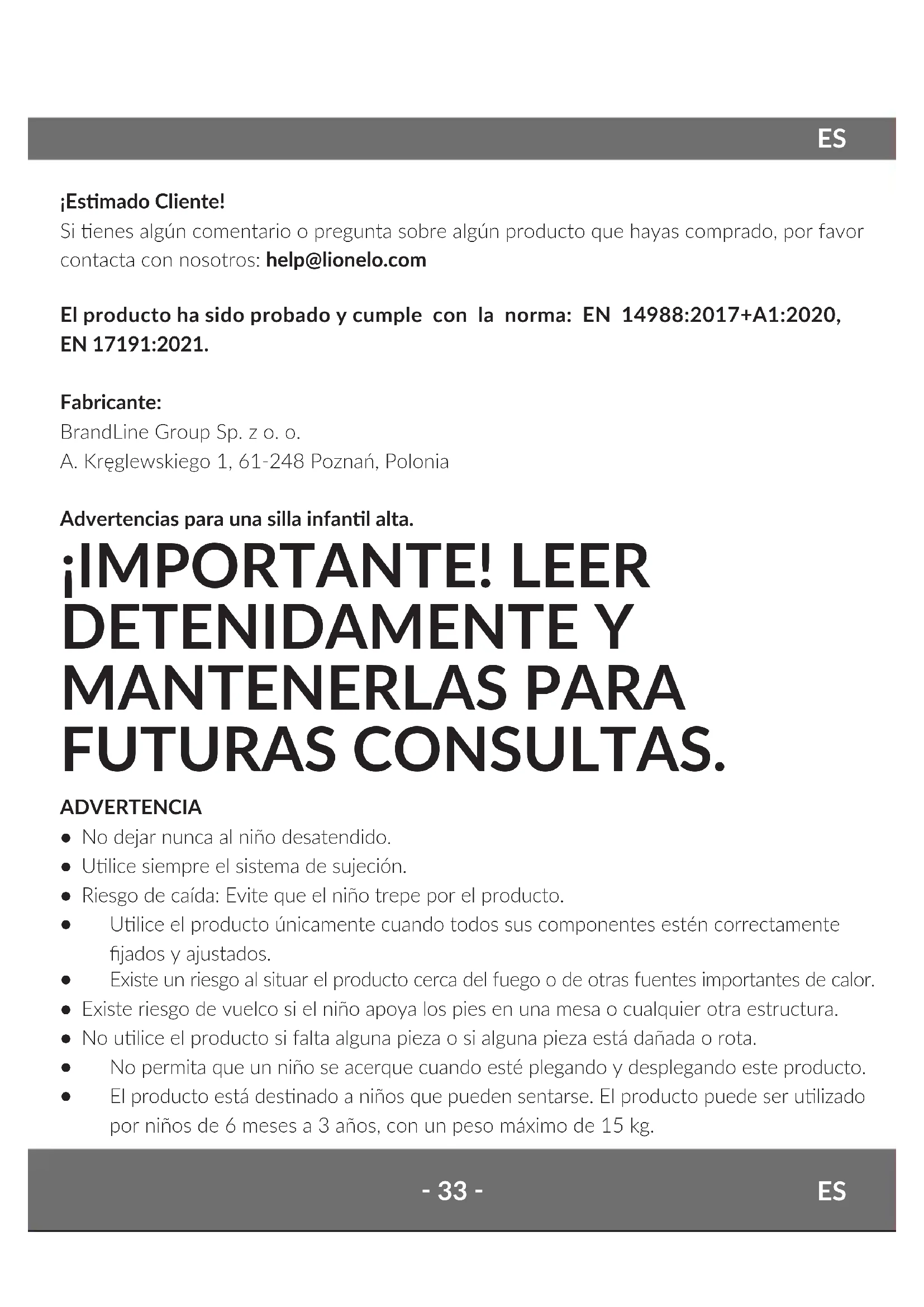¡Esmado Cliente! Si enes algún comentario o pregunta sobre algún producto que hayas comprado, por favor contacta con nosotros: help@lionelo.com El producto ha sido probado y cumple con la norma: EN 14988:2017+A1:2020, EN 17191:2021. Fabricante: BrandLine Group Sp. z o. o. A. Kręglewskiego 1, 61-248 Poznań, Polonia Advertencias para una silla infanl alta. ¡IMPORTANTE! LEER DETENIDAMENTE Y MANTENERLAS PARA FUTURAS CONSULTAS. ADVERTENCIA