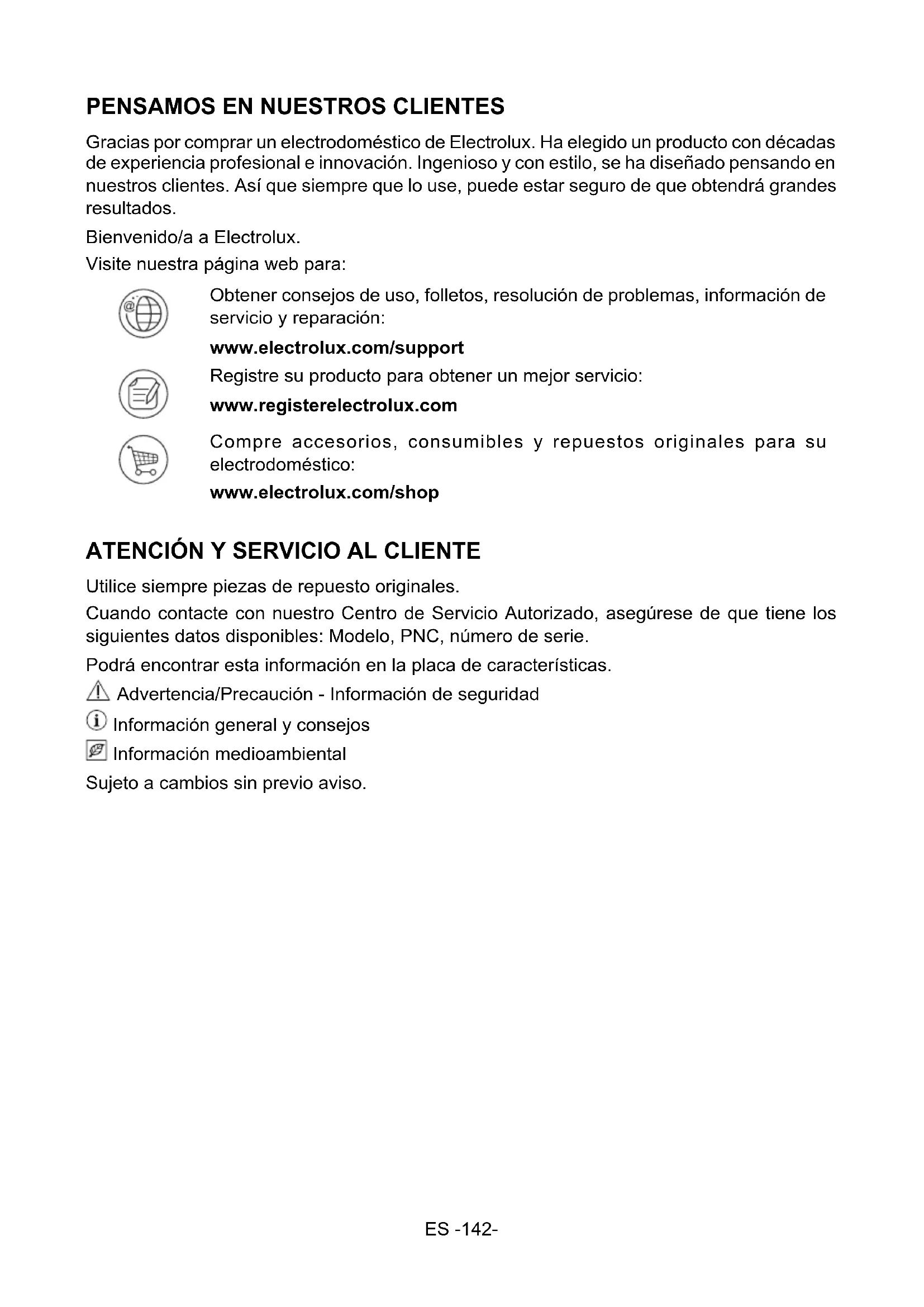 Gracias por comprar un electrodoméstico de Electrolux. Ha elegido un producto con décadas de experiencia profesional e innovación. Ingenioso y con estilo, se ha diseñado pensando en nuestros clientes. Así que siempre que lo use, puede estar seguro de que obtendrá grandes resultados. Bienvenido/a a Electrolux. Visite nuestra página web para: Obtener consejos de uso, folletos, resolución de problemas, información de servicio y reparación: www.electrolux.com/support Registre su producto para obtener un mejor servicio: www.registerelectrolux.com Compre accesorios, consumibles y repuestos originales para su electrodoméstico: www.electrolux.com/shop