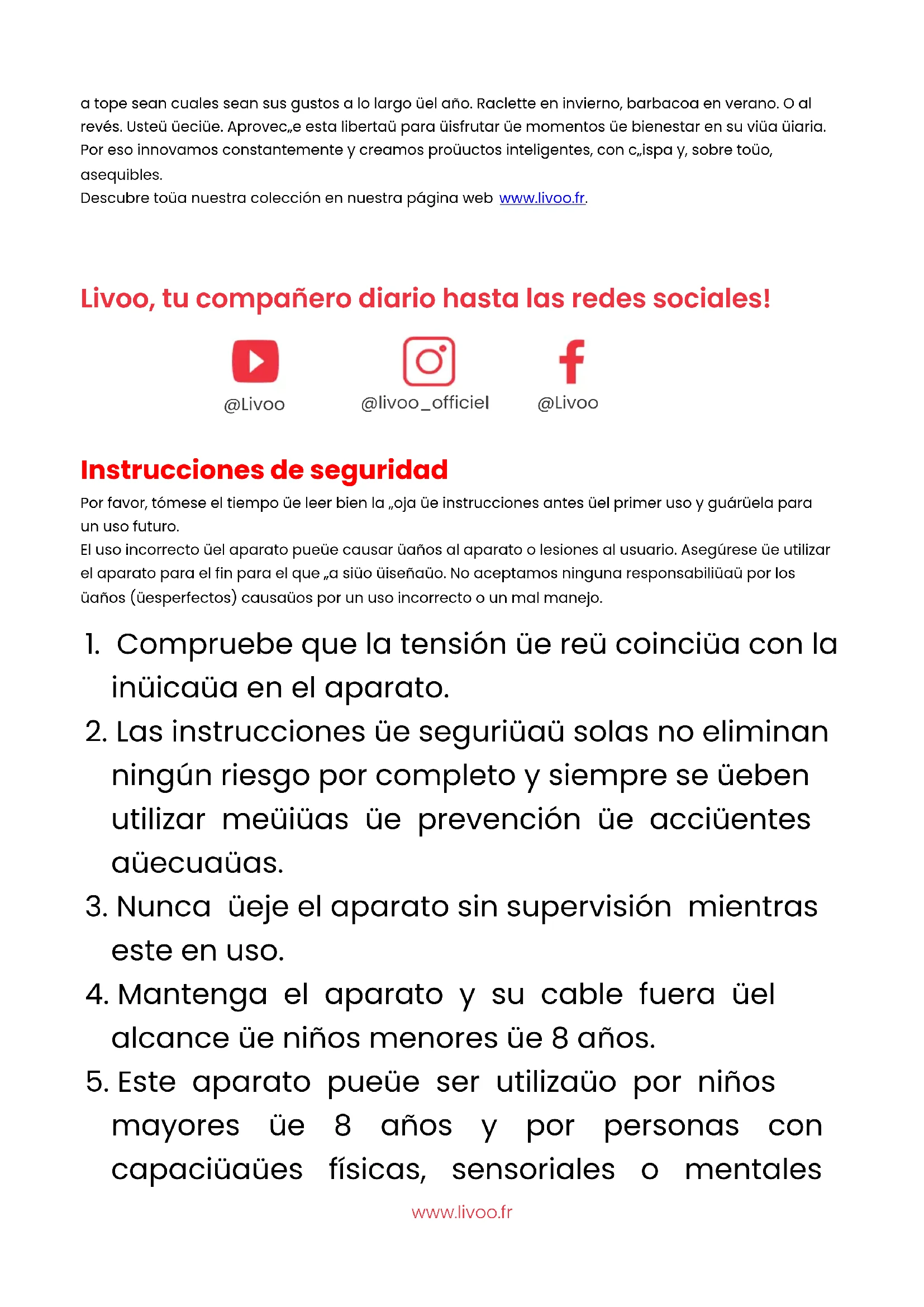 Gracias por haber elegido un producto Livoo! Su batidora, su barbacoa, sus auriculares no son simples objetos, son una extensión de usted que le permite conectar con su gente, reunirla, reír e interactuar. El objetivo de Livoo es ayudarle a vivir su vida ESwww.livoo.fr a tope sean cuales sean sus gustos a lo largo del año. Raclette en invierno, barbacoa en verano. O al revés. Usted decide. Aproveche esta libertad para disfrutar de momentos de bienestar en su vida diaria. Por eso innovamos constantemente y creamos productos inteligentes, con chispa y, sobre todo, asequibles. Descubre toda nuestra colección en nuestra página web www.livoo.fr.
