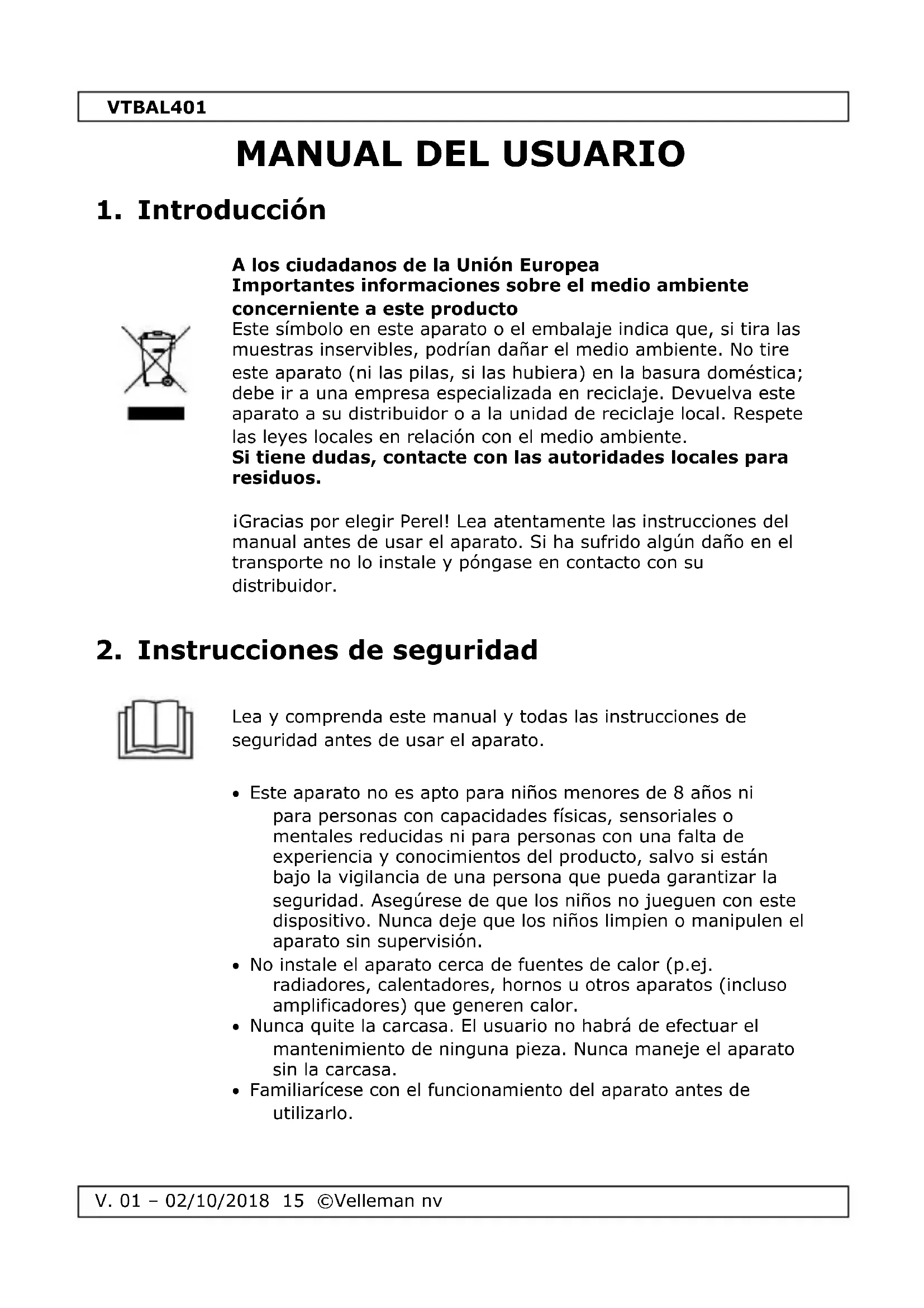 Velleman NV dispone de los derechos de autor para este manual del usuario. Todos los derechos mundiales reservados. Está estrictamente prohibido reproducir, traducir, copiar, editar y guardar este manual del usuario o partes de ello sin el consentimiento previo por escrito del propietario del copyright.VTBAL401
