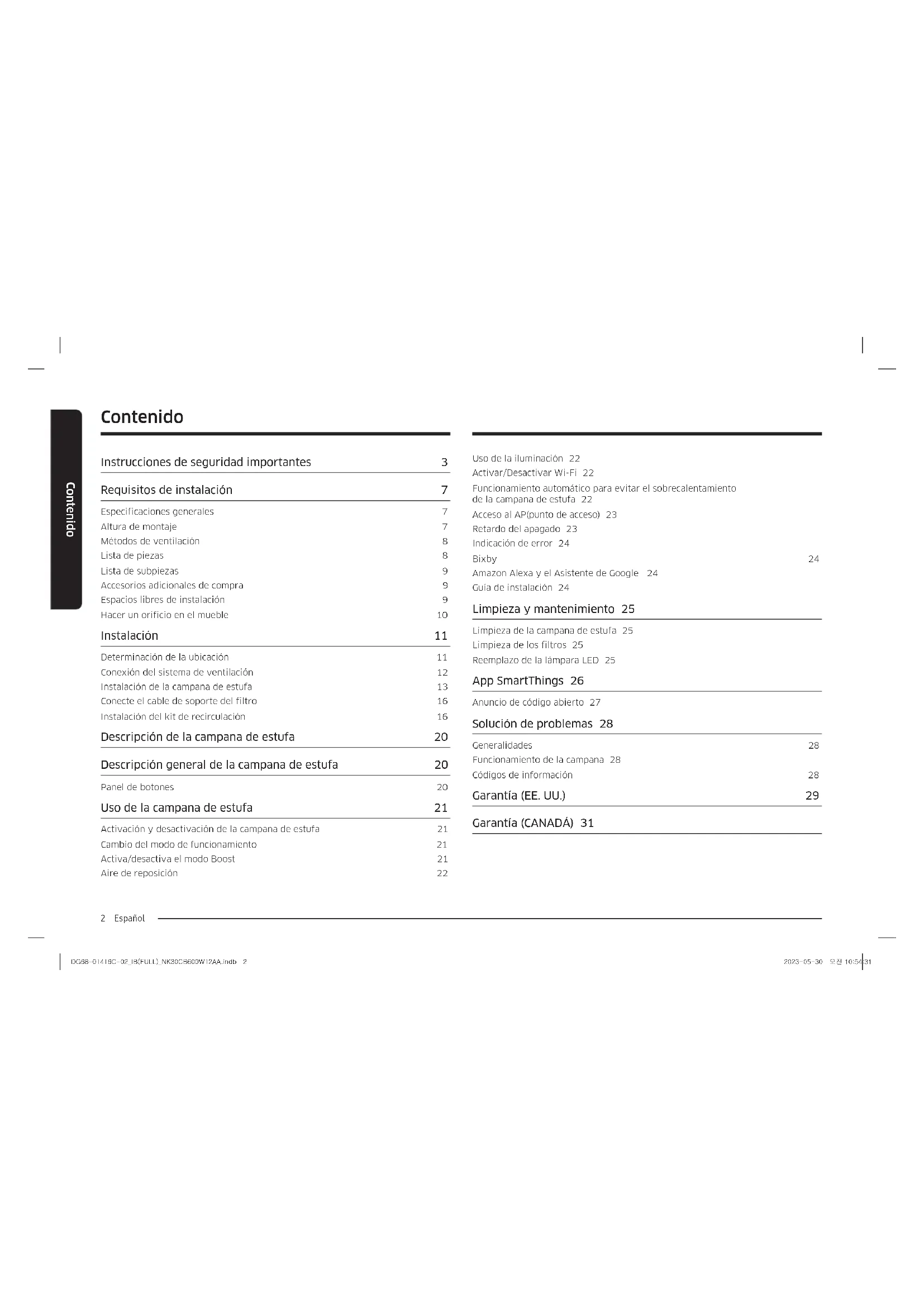 Uso de la iluminación 22 Activar/Desactivar Wi-Fi 22 Funcionamiento automático para evitar el sobrecalentamiento de la campana de estufa 22 Acceso al AP(punto de acceso) 23 Retardo del apagado 23 Indicación de error 24 Bixby 24 Amazon Alexa y el Asistente de Google 24 Guía de instalación 24 Limpieza y mantenimiento 25 Limpieza de la campana de estufa 25 Limpieza de los filtros 25 Reemplazo de la lámpara LED 25 App SmartThings 26 Anuncio de código abierto 27 Solución de problemas 28 Generalidades 28 Funcionamiento de la campana 28 Códigos de información 28 Garantía (EE. UU.) 29 Garantía (CANADÁ) 31 Contenido Instrucciones de seguridad importantes 3 Requisitos de instalación 7 Especificaciones generales 7 Altura de montaje 7 Métodos de ventilación 8 Lista de piezas 8 Lista de subpiezas 9 Accesorios adicionales de compra 9 Espacios libres de instalación 9 Hacer un orificio en el mueble 10 Instalación 11 Determinación de la ubicación 11 Conexión del sistema de ventilación 12 Instalación de la campana de estufa 13 Conecte el cable de soporte del filtro 16 Instalación del kit de recirculación 16 Descripción de la campana de estufa 20 Descripción general de la campana de estufa 20 Panel de botones 20 Uso de la campana de estufa 21 Activación y desactivación de la campana de estufa 21 Cambio del modo de funcionamiento 21 Activa/desactiva el modo Boost 21 Aire de reposición 22 DG68-01416C-02_IB(FULL)_NK30CB600W12AA.indb 2DG68-01416C-02_IB(FULL)_NK30CB600W12AA.indb 2 2023-05-30 오전 10:54:312023-05-30 오전 10:54:31Español 3Español 3 Instrucciones de seguridad importantes