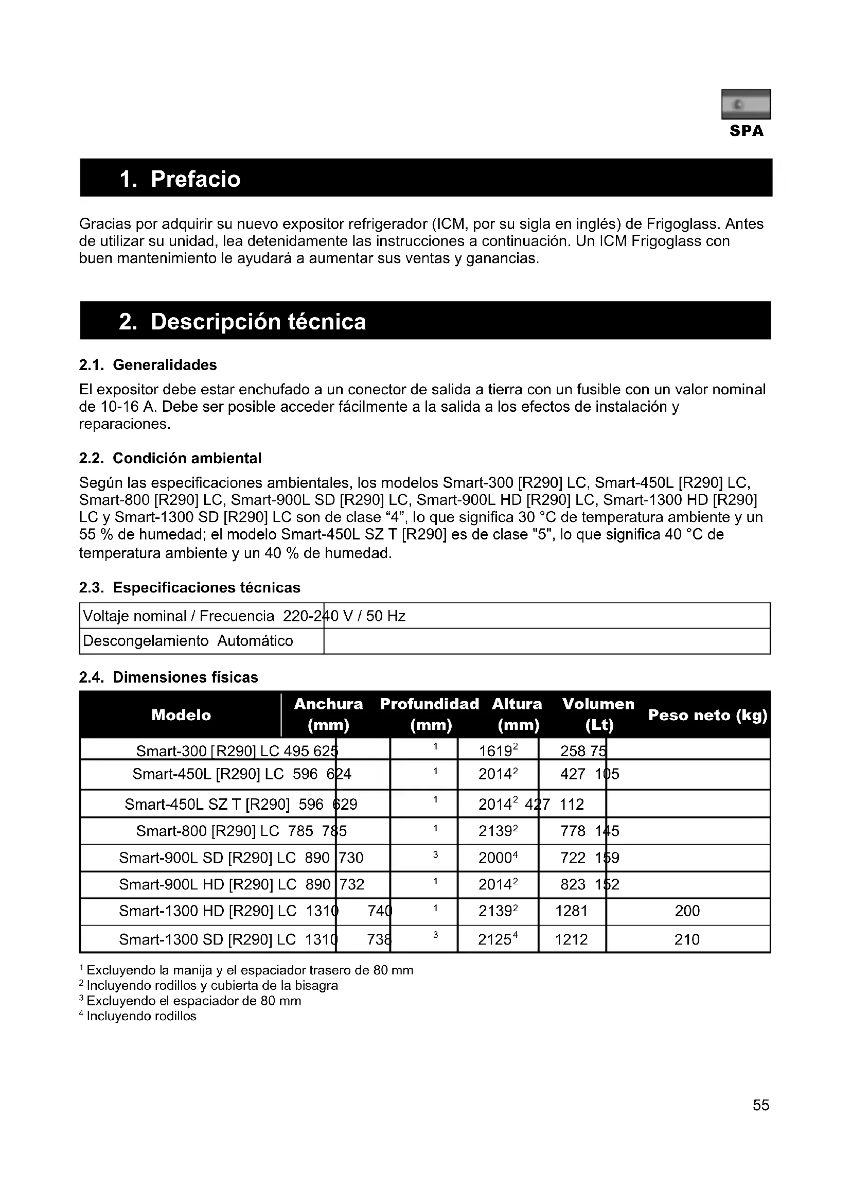 2.1. Generalidades El expositor debe estar enchufado a un conector de salida a tierra con un fusible con un valor nominal de 10-16 A. Debe ser posible acceder fácilmente a la salida a los efectos de instalación y reparaciones. 2.2. Condición ambiental Según las especificaciones ambientales, los modelos Smart-300 [R290] LC, Smart-450L [R290] LC, Smart-800 [R290] LC, Smart-900L SD [R290] LC, Smart-900L HD [R290] LC, Smart-1300 HD [R290] LC y Smart-1300 SD [R290] LC son de clase “4”, lo que significa 30 °C de temperatura ambiente y un 55 % de humedad; el modelo Smart-450L SZ T [R290] es de clase "5", lo que significa 40 °C de temperatura ambiente y un 40 % de humedad. 2.3. Especificaciones técnicas Voltaje nominal / Frecuencia 220-240 V / 50 Hz Descongelamiento Automático 2.4. Dimensiones físicas Modelo Anchura (mm) Profundidad (mm) Altura (mm) Volumen (Lt) Peso neto (kg) Smart-300