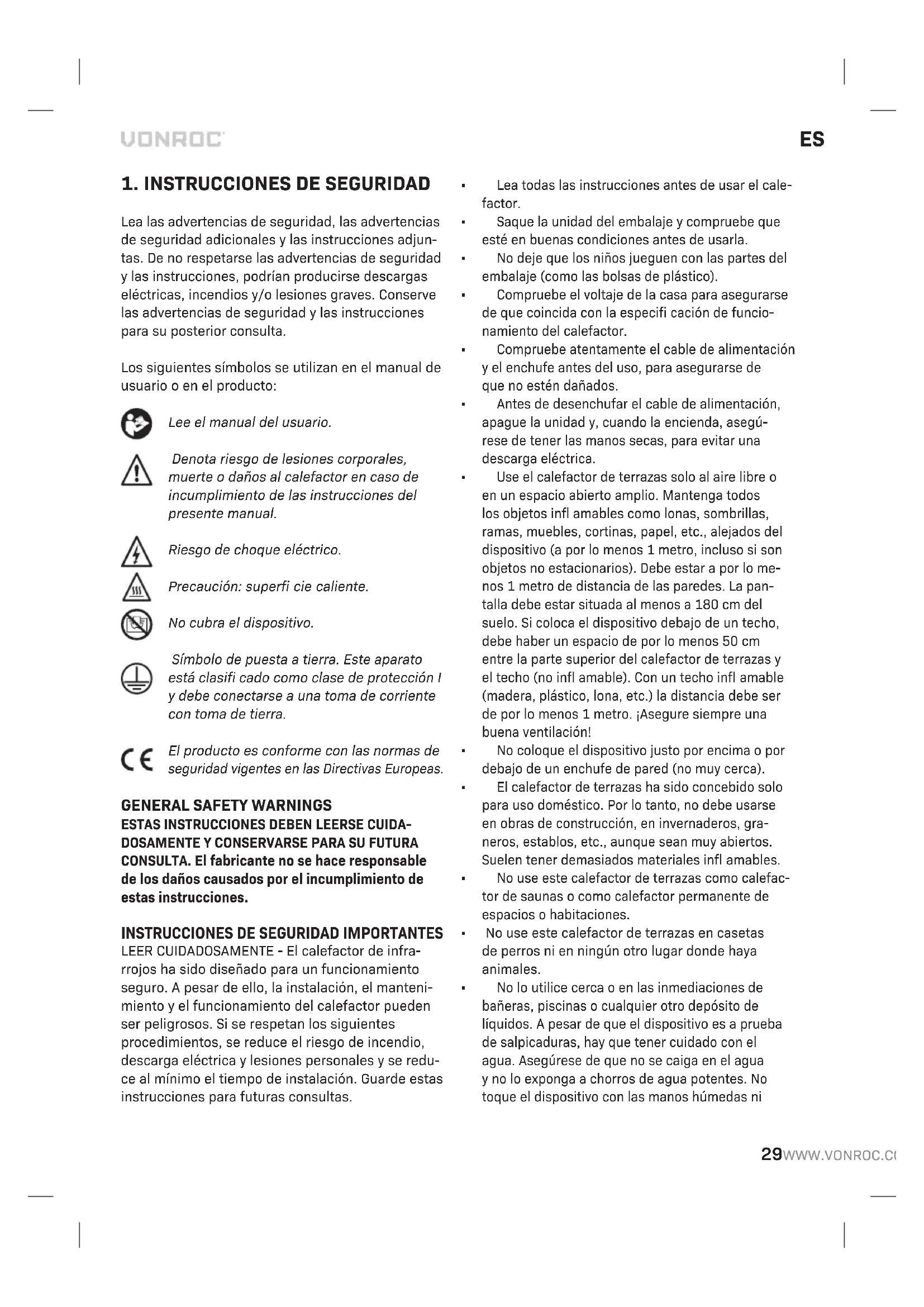 Lea las advertencias de seguridad, las advertencias de seguridad adicionales y las instrucciones adjun- tas. De no respetarse las advertencias de seguridad y las instrucciones, podrían producirse descargas eléctricas, incendios y/o lesiones graves. Conserve las advertencias de seguridad y las instrucciones para su posterior consulta. Los siguientes símbolos se utilizan en el manual de usuario o en el producto: Lee el manual del usuario. Denota riesgo de lesiones corporales, muerte o daños al calefactor en caso de incumplimiento de las instrucciones del presente manual. Riesgo de choque eléctrico. Precaución: superfi cie caliente. No cubra el dispositivo. Símbolo de puesta a tierra. Este aparato está clasifi cado como clase de protección I y debe conectarse a una toma de corriente con toma de tierra. El producto es conforme con las normas de seguridad vigentes en las Directivas Europeas.