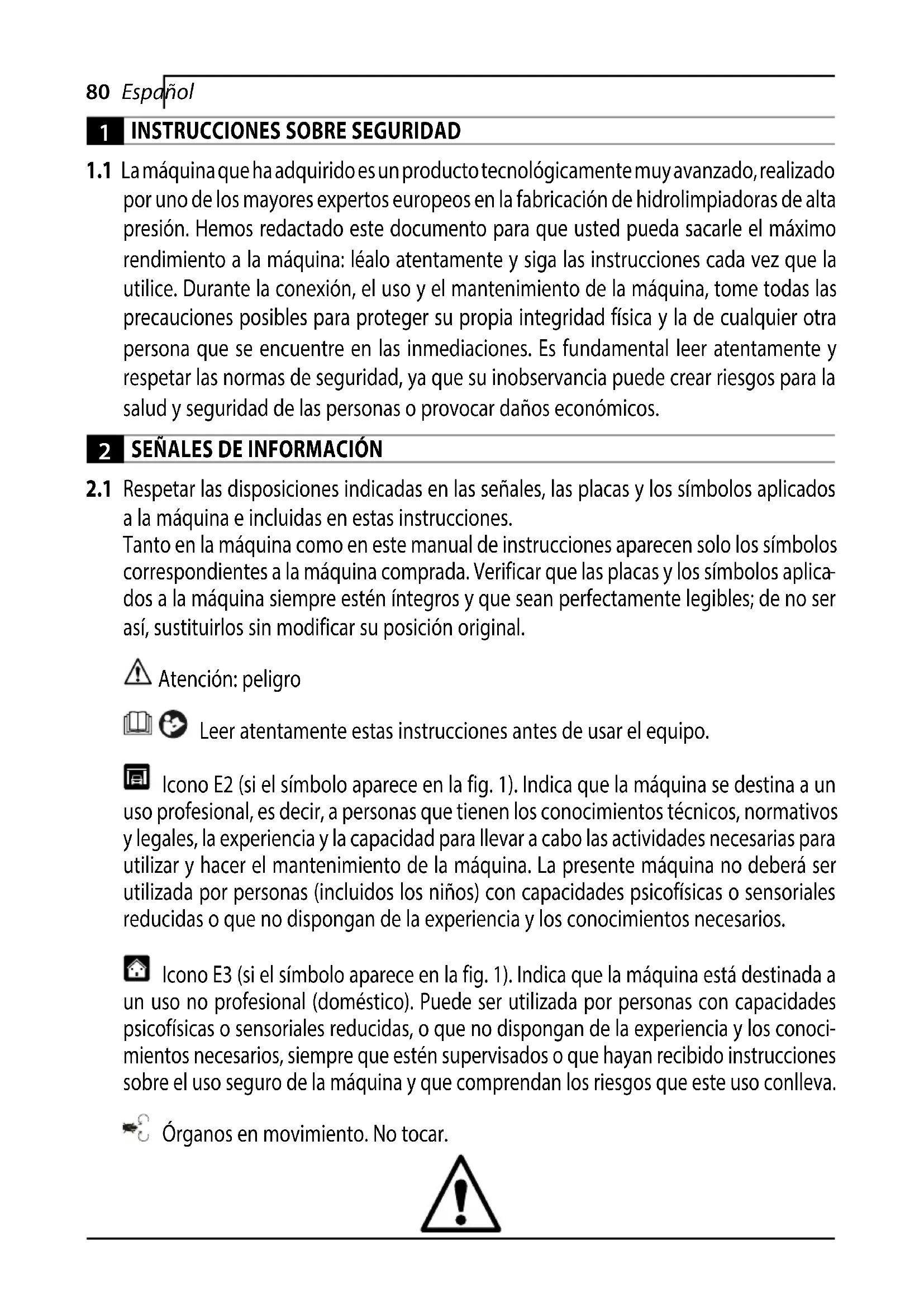 dos a la máquina siempre estén íntegros y que sean perfectamente legibles; de no ser así, sustituirlos sin modificar su posición original. Atención: peligro Leer atentamente estas instrucciones antes de usar el equipo. Icono E2 (si el símbolo aparece en la fig. 1). Indica que la máquina se destina a un uso profesional, es decir, a personas que tienen los conocimientos técnicos, normativos y legales, la experiencia y la capacidad para llevar a cabo las actividades necesarias para utilizar y hacer el mantenimiento de la máquina. La presente máquina no deberá ser utilizada por personas (incluidos los niños) con capacidades psicofísicas o sensoriales reducidas o que no dispongan de la experiencia y los conocimientos necesarios. Icono E3 (si el símbolo aparece en la fig. 1). Indica que la máquina está destinada a un uso no profesional (doméstico). Puede ser utilizada por personas con capacidades psicofísicas o sensoriales reducidas, o que no dispongan de la experiencia y los conoci