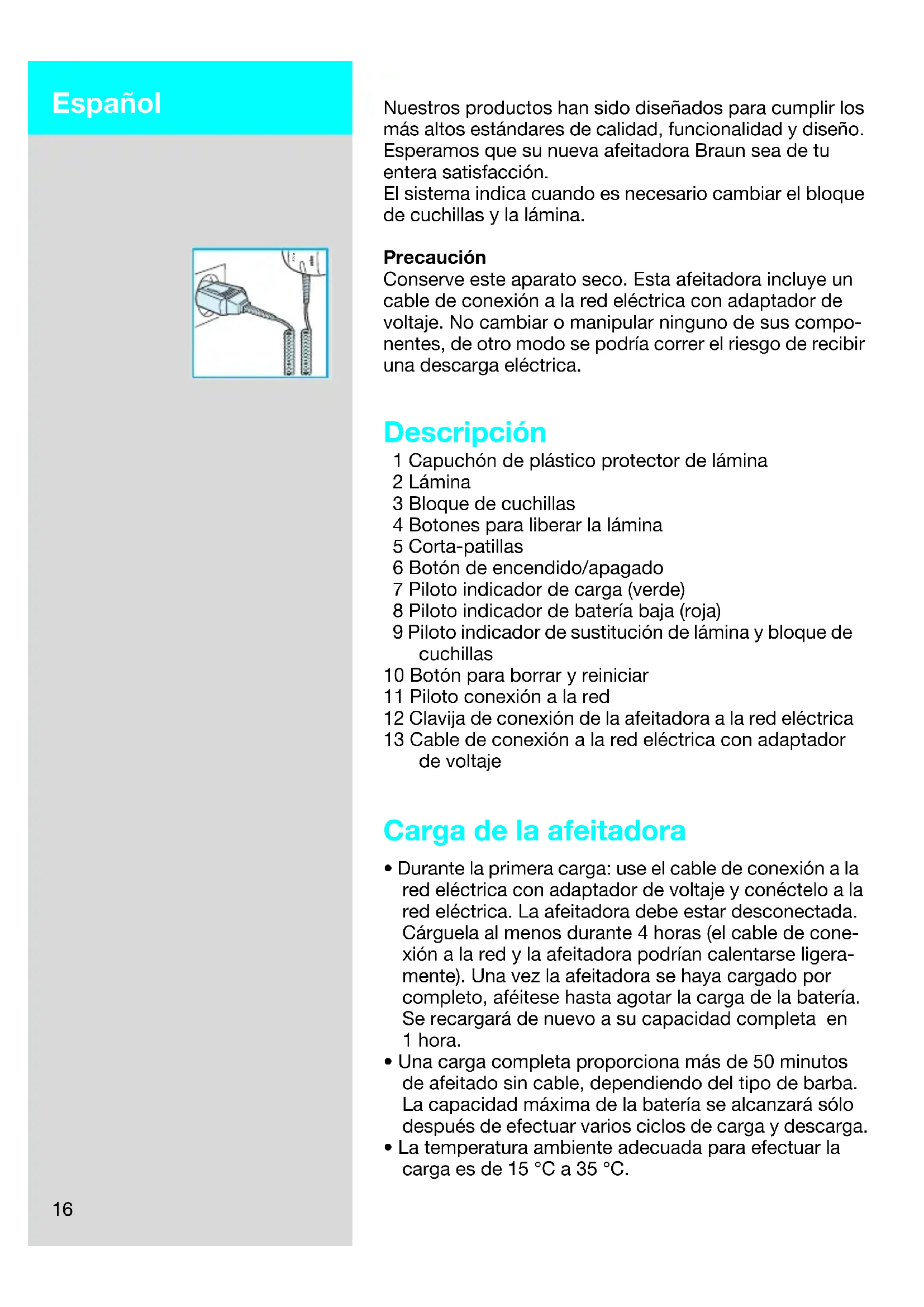 - Durante la primera carga: use el cable de conexión a la red eléctrica con adaptador de voltaje y conéctelo a la red eléctrica. La afeitadora debe estar desconectada. Cárguela al menos durante 4 horas (el cable de cone- xión a la red y la afeitadora podrían calentarse ligera- mente). Una vez la afeitadora se haya cargado por completo, aféitese hasta agotar la carga de la batería. Se recargará de nuevo a su capacidad completa en 1 hora.
