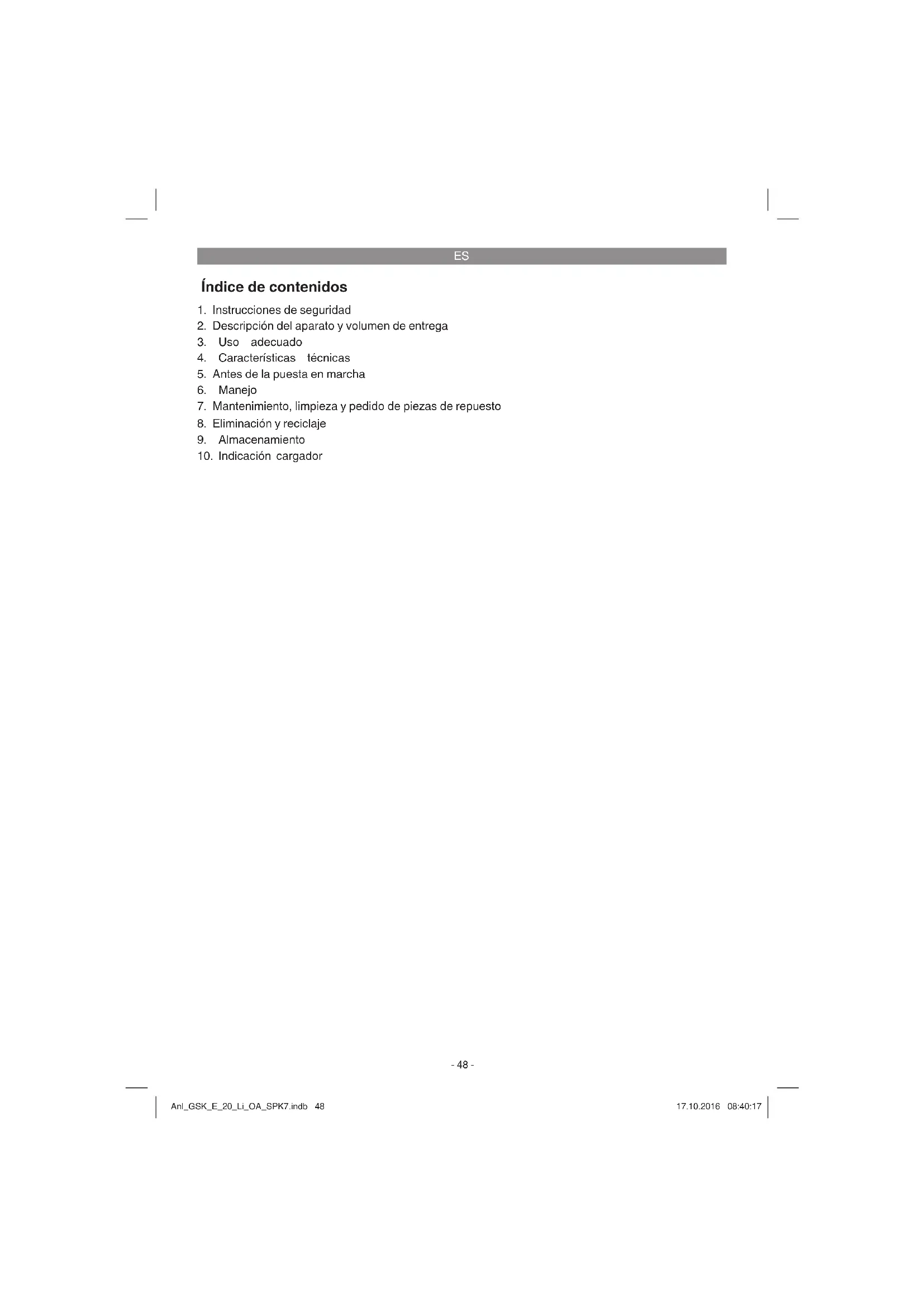 Sólo para países miembros de la UE No tirar herramientas eléctricas en la basura casera. Según la directiva europea 2012/19/CE sobre aparatos usados electrónicos y eléctricos y su aplicación en el derecho nacional, dichos aparatos deberán recojerse por separado y eliminarse de modo ecológi- co para facilitar su posterior reciclaje. Alternativa de reciclaje en caso de devolución: El propietario del aparato eléctrico, en caso de no optar por su devolución, está obligado a reciclar ade- cuadamente dicho aparato eléctrico. Para ello, también se puede entregar el aparato usado a un centro de reciclaje que trate la eliminación de residuos respetando la legislación nacional sobre residuos y su reciclaje. Esto no afecta a los medios auxiliares ni a los accesorios sin componentes eléctricos que acompañan a los aparatos usados. Sólo está permitido copiar la documentación y documentos anexos del producto, o extractos de los mismos, con autorización expresa de iSC GmbH. Nos reservamos el derecho a realizar modifi caciones técnicas Anl_GSK_E_20_Li_OA_SPK7.indb 55Anl_GSK_E_20_Li_OA_SPK7.indb 55 17.10.2016 08:40:1817.10.2016 08:40:18ES