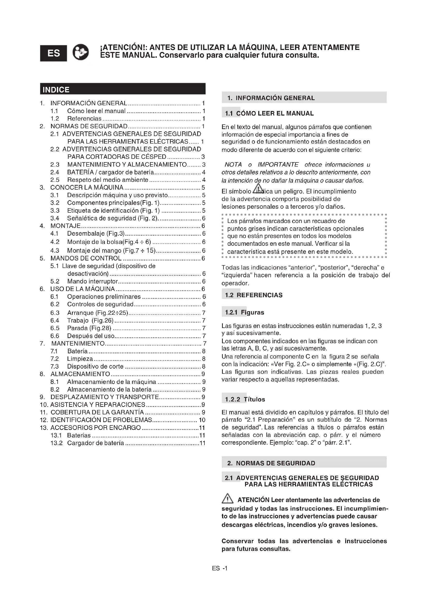 Device used to recharge the battery (Fig. 36).ES -1 ¡ATENCIÓN!: ANTES DE UTILIZAR LA MÁQUINA, LEER ATENTAMENTE ESTE MANUAL. Conservarlo para cualquier futura consulta.