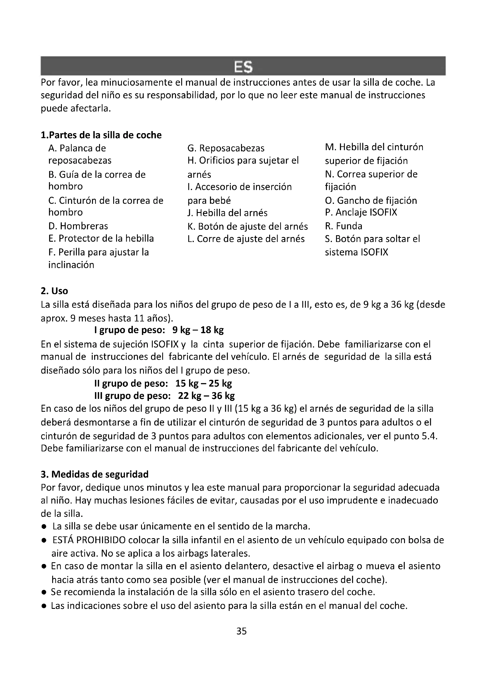 Por favor, dedique unos minutos y lea este manual para proporcionar la seguridad adecuada al niño. Hay muchas lesiones fáciles de evitar, causadas por el uso imprudente e inadecuado de la silla. ● La silla se debe usar únicamente en el sentido de la marcha. ● ESTÁ PROHIBIDO colocar la silla infantil en el asiento de un vehículo equipado con bolsa de aire activa. No se aplica a los airbags laterales. ● En caso de montar la silla en el asiento delantero, desactive el airbag o mueva el asiento hacia atrás tanto como sea posible (ver el manual de instrucciones del coche). ● Se recomienda la instalación de la silla sólo en el asiento trasero del coche. ● Las indicaciones sobre el uso del asiento para la silla están en el manual del coche.36 ● Solo se puede colocar en los vehículos homologados provistos de cinturones de tres puntos con retractor que hayan obtenido la homologación según el reglamento CEPE nº 16 o equivalente. ● Todas las correas de fijación de la silla deben ser tensadas; el arnés debe ser ajustado al cuerpo del niño y el cinturón/arnés no debe estar torcido. ● La silla debe reemplazarse si ha sufrido un impacto durante el accidente. ● La silla no debe modificarse. ● La silla debe protegerse contra la luz solar directa para evitar quemaduras del niño. ● Nunca deje al niño en la silla sin vigilancia. ● Preste atención a que el equipaje y otros artículos estén bien asegurados, en particular, en el estante debajo de la ventana trasera, porque en caso de una colisión pueden causar lesiones. ● La silla no puede usarse sin el tapizado. ● No se debe usar el tapizado de cambio, distinto del recomendado por el fabricante, porque éste forma parte integral del sistema de seguridad de la silla. ● Se recomienda guardar el manual de instrucciones de la silla durante todo el período de su uso. ● No se deben utilizar otros puntos de fijación que los descritos en el manual y los marcados en la silla. ● Todos los elementos duros y de plástico de la silla deben colocarse e instalarse de tal manera que, en condiciones normales de explotación del vehículo, no queden atrapados por el asiento deslizante o la puerta del vehículo. ● Se debe comprobar regularmente el estado técnico del arnés de seguridad, prestando atención particular a los puntos de fijación, las costuras y los elementos de ajuste. ● No se deberá usar la silla si sus partes han sufrido un daño o están flojas después de un accidente. ● En caso de una situación de emergencia, es importante desabrochar rápido el cinturón de seguridad. Esto significa que el botón de liberación del arnés no está totalmente protegido, asegúrese de que su hijo sabe que no debe jugar con la hebilla. ● No utilice la silla en casa. La silla no es adecuada para el uso doméstico y debe utilizarse sólo durante el viaje en coche. ● La parte trasera del respaldo de la silla debe apoyarse libremente sobre el respaldo del asiento del coche. Preste atención a que a través del reposacabezas del coche no haya un espacio no deseado entre el respaldo de la silla y el respaldo del asiento del vehículo. Algunos reposacabezas de automóviles son un obstáculo para la instalación de la silla de coche y por lo tanto deben ser desmontados primero. ● La hebilla del cinturón de seguridad para adultos no puede estar demasiado cerca de la parte inferior del apoyabrazos de la silla. En caso de dudas acerca de este punto, póngase en contacto con el fabricante de la silla. ● Usted debe darle a su hijo un buen ejemplo y siempre ponerse el cinturón. El peligro para el niño también puede ser un adulto no abrochado con el cinturón de seguridad. ● Antes de cada viaje, asegúrese de que la silla está bien fijada.37 ● Fije la silla incluso cuando no está en uso. La silla no asegurada puede causar lesión de los pasajeros incluso en caso de un frenado de emergencia.
