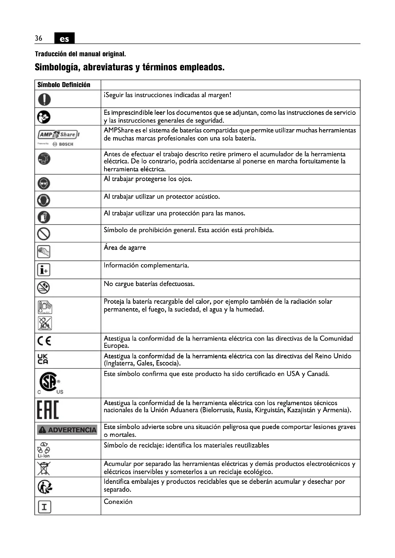 Traducción del manual original. Simbología, abreviaturas y términos empleados. Símbolo Definición ¡Seguir las instrucciones indicadas al margen! Es imprescindible leer los documentos que se adjuntan, como las instrucciones de servicio y las instrucciones generales de seguridad. AMPShare es el sistema de baterías compartidas que permite utilizar muchas herramientas de muchas marcas profesionales con una sola batería. Antes de efectuar el trabajo descrito retire primero el acumulador de la herramienta eléctrica. De lo contrario, podría accidentarse al ponerse en marcha fortuitamente la herramienta eléctrica. Al trabajar protegerse los ojos. Al trabajar utilizar un protector acústico. Al trabajar utilizar una protección para las manos. Símbolo de prohibición general. Esta acción está prohibida. Área de agarre Información complementaria. No cargue baterías defectuosas. Proteja la batería recargable del calor, por ejemplo también de la radiación solar permanente, el fuego, la suciedad, el agua y la humedad. Atestigua la conformidad de la herramienta eléctrica con las directivas de la Comunidad Europea. Atestigua la conformidad de la herramienta eléctrica con las directivas del Reino Unido (Inglaterra, Gales, Escocia). Este símbolo confirma que este producto ha sido certificado en USA y Canadá. Atestigua la conformidad de la herramienta eléctrica con los reglamentos técnicos nacionales de la Unión Aduanera (Bielorrusia, Rusia, Kirguistán, Kazajistán y Armenia). Este símbolo advierte sobre una situación peligrosa que puede comportar lesiones graves o mortales. Símbolo de reciclaje: identifica los materiales reutilizables Acumular por separado las herramientas eléctricas y demás productos electrotécnicos y eléctricos inservibles y someterlos a un reciclaje ecológico. Identifica embalajes y productos reciclables que se deberán acumular y desechar por separado. Conexión max.50°C ADVERTENCIA37