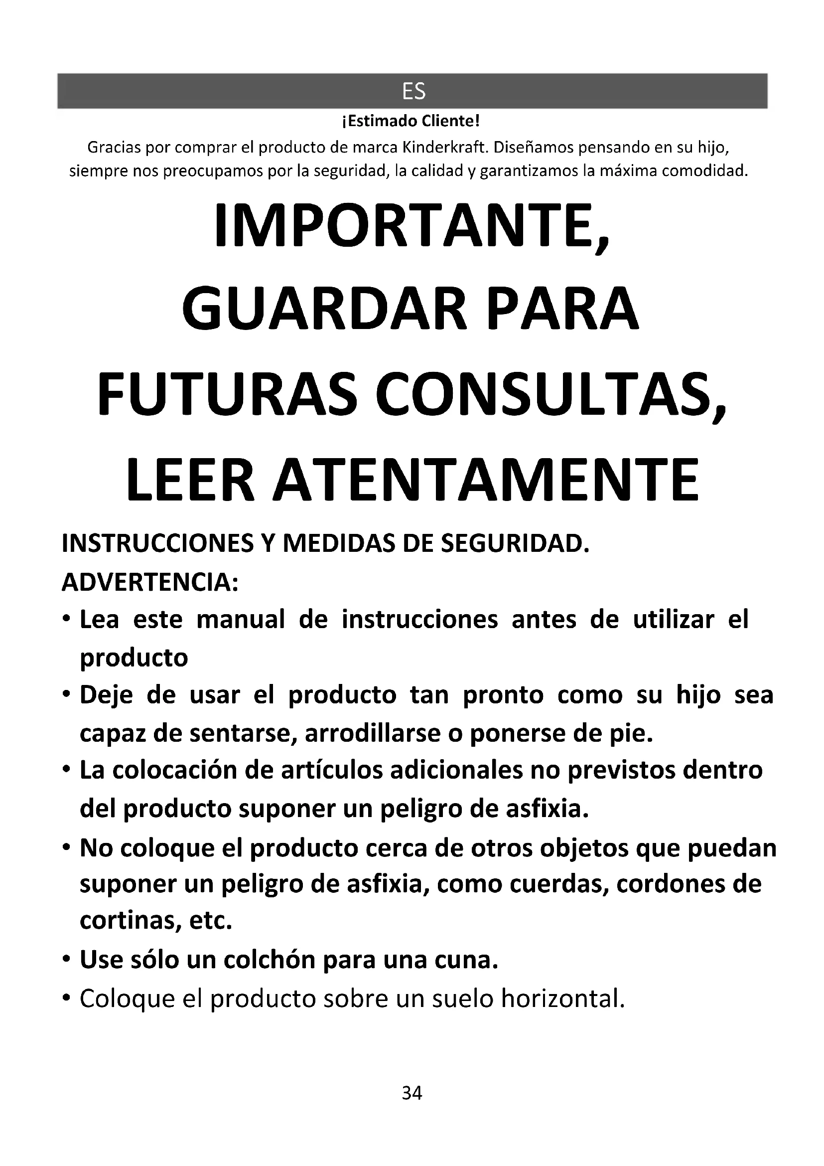 ¡Estimado Cliente! Gracias por comprar el producto de marca Kinderkraft. Diseñamos pensando en su hijo, siempre nos preocupamos por la seguridad, la calidad y garantizamos la máxima comodidad. IMPORTANTE, GUARDAR PARA FUTURAS CONSULTAS, LEER ATENTAMENTE INSTRUCCIONES Y MEDIDAS DE SEGURIDAD. ADVERTENCIA: