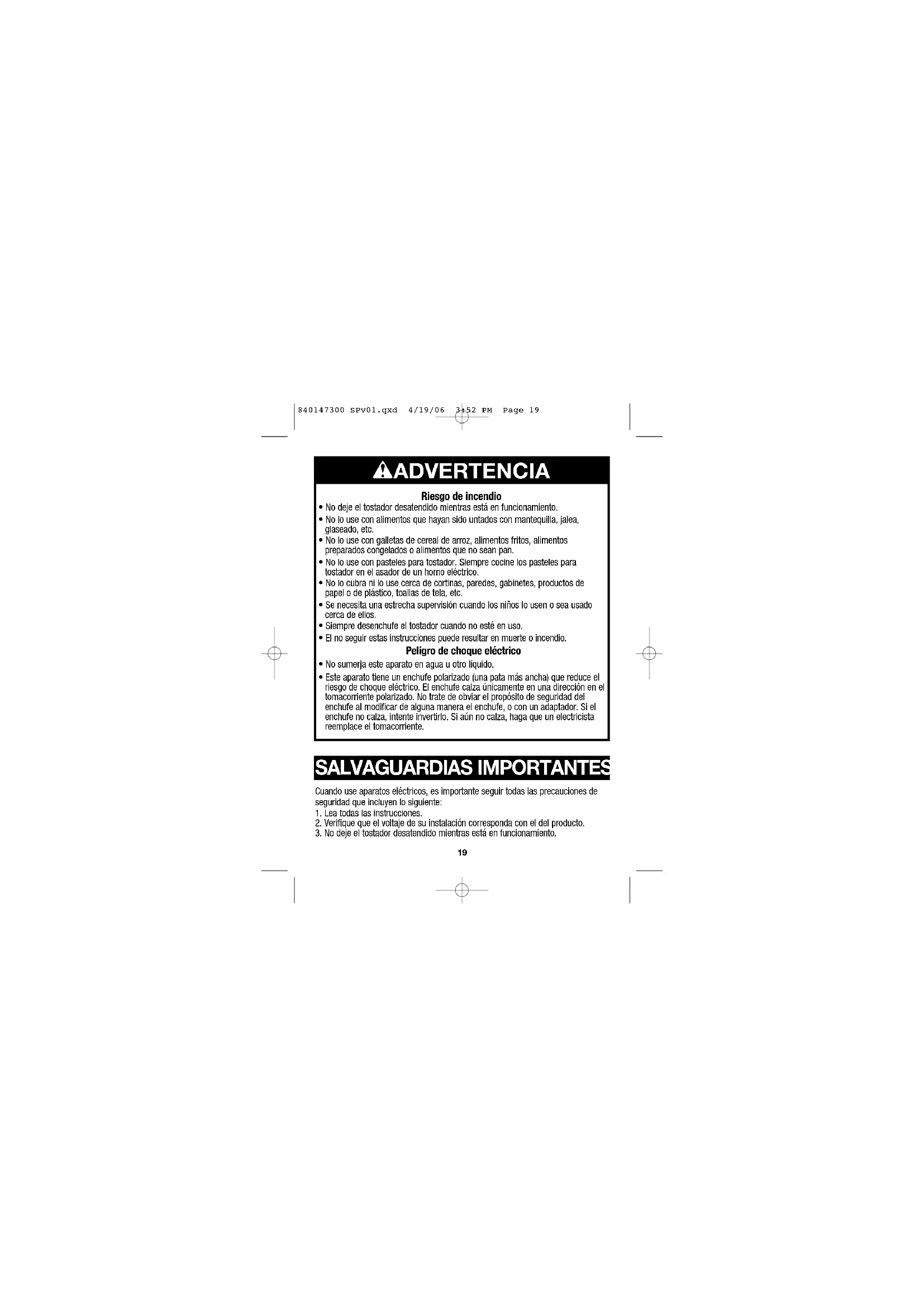 840147300 SPv01.qxd 4/19/06 3:52 PM Page 1921 INFORMACIÓN ADICIONAL PARA LA SEGURIDAD DEL CONSUMIDOR Para evitar una sobrecarga del circuito, no opere otro aparato electrodoméstico de alto consumo de corriente en el mismo circuito. El largo del cable que se utiliza con este artefacto fue elegido para reducir el riesgo de enredarse o de tropezarse con él si fuese más largo. Si se necesita un cable eléctrico más largo, podrá usarse un cable de extensión aprobado. La potencia eléctrica del cable de extensión deberá ser igual o mayor que la del tostador. Se debe tener cuidado al acomodar el cable de extensión de manera que no cuelgue por el borde de la mesa o mostrador y que los niños no puedan jalarlo o tropezarse accidentalmente.