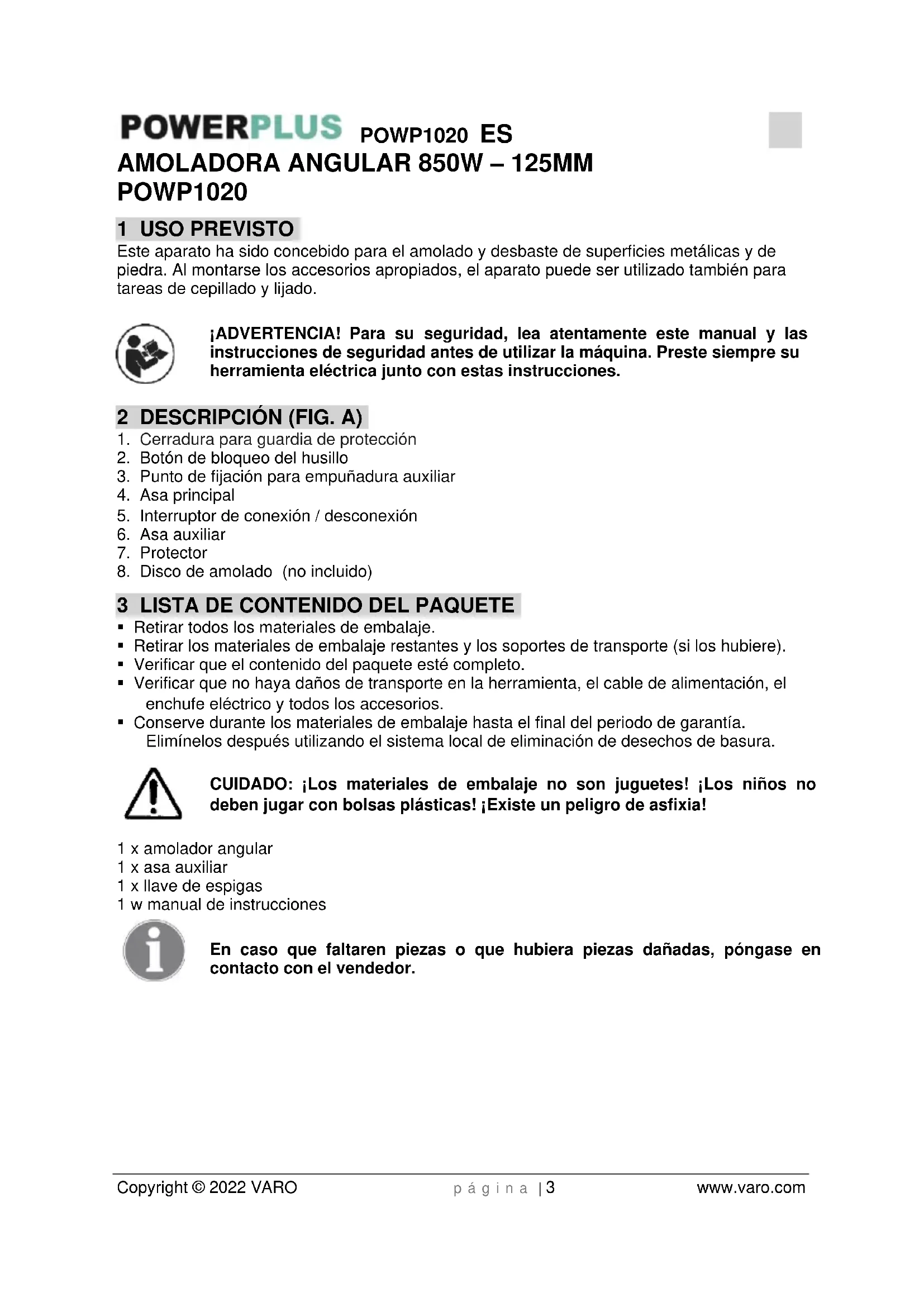- Conserve durante los materiales de embalaje hasta el final del periodo de garantía. Elimínelos después utilizando el sistema local de eliminación de desechos de basura. CUIDADO: ¡Los materiales de embalaje no son juguetes! ¡Los niños no deben jugar con bolsas plásticas! ¡Existe un peligro de asfixia! 1 x amolador angular 1 x asa auxiliar 1 x llave de espigas 1 w manual de instrucciones En caso que faltaren piezas o que hubiera piezas dañadas, póngase en contacto con el vendedor.POWP1020 ES Copyright © 2022 VARO p á g i n a | 4 www.varo.com 4 SÍMBOLOS En este manual y/o en el aparato mismo se utilizan los siguientes símbolos: