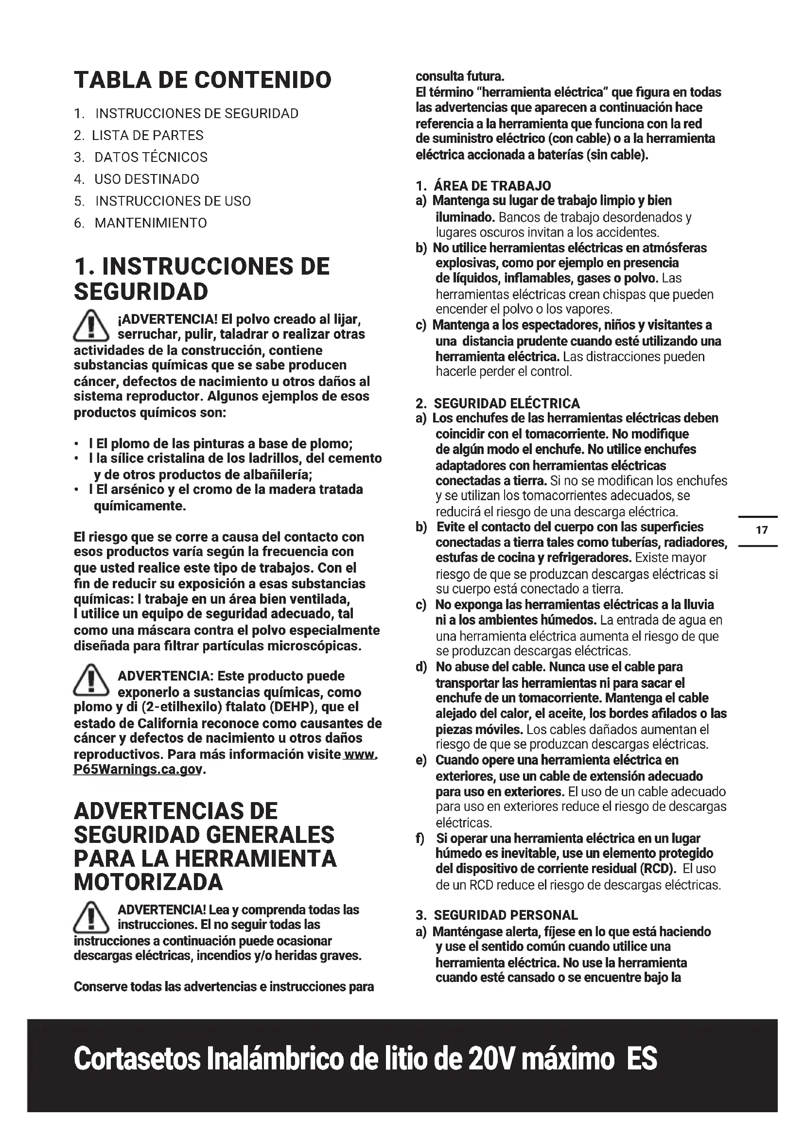 a) Manténgase alerta, fíjese en lo que está haciendo y use el sentido común cuando utilice una herramienta eléctrica. No use la herramienta cuando esté cansado o se encuentre bajo la18 Cortasetos Inalámbrico de litio de 20V máximo ES inuencia de drogas, alcohol o medicamentos. Un momento de distracción al utilizar herramientas eléctricas puede dar lugar a lesiones personales graves. b) Utilice equipo de seguridad. Use siempre protección ocular. La utilización del equipo de seguridad como mascara antipolvo, zapatos de seguridad antideslizantaes, casco o protección auditiva para condiciones adecuadas reducirá el riego de lesiones personales. c) Evite el arranque accidental. Asegúrese de que el interruptor esté en la posición de trabado o de apagado antes de instalar el paquete de baterías. Transportar herramientas con el dedo en el interruptor o instalar el paquete de batería cuando el interruptor está encendido invitan a los accidentes. d) Retire las llaves o claves de ajuste antes de encender la herramienta. Una llave o clave de ajuste dejada en una parte giratoria de la herramienta puede causar una lesión personal. e) No intente alcanzar demasiado lejos. Mantenga un apoyo de los pies y un equilibrio adecuados en todo momento. El apoyo de los pies y el equilibrio adecuados permiten un mejor control de la herramienta en situaciones inesperadas. f) Vístase apropiadamente. No se ponga ropa holgada ni joyas. Mantenga su cabello, ropa y guantes alejados de las piezas móviles. La ropa holgada, las joyas o el pelo largo pueden quedar atrapados en las piezas móviles. g) Si se proporcionan dispositivos para la extracción y recolección de polvo, asegúrese que estos estén conectados y utilizados correctamente. El uso de estos dispositivos puede reducir peligros relacionados con el polvo. h) No permita que la familiaridad obtenida a partir del uso frecuente de otras herramientas le permita volverse complaciente e ignorar los principios de seguridad de la herramienta. Una acción descuidada puede causar lesiones severas en una fracción de segundo.