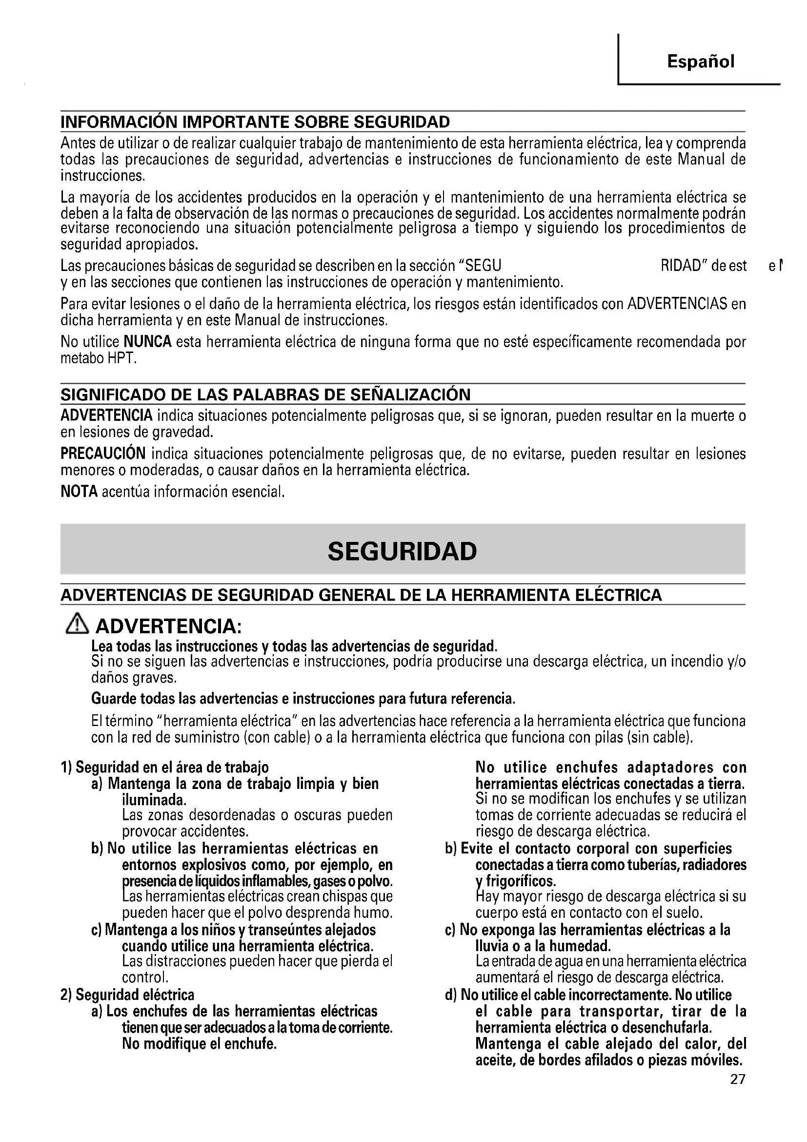 Antes de utilizar o de realizar cualquier trabajo de mantenimiento de esta herramienta eléctrica, lea y comprenda todas las precauciones de seguridad, advertencias e instrucciones de funcionamiento de este Manual de instrucciones. La mayoría de los accidentes producidos en la operación y el mantenimiento de una herramienta eléctrica se deben a la falta de observación de las normas o precauciones de seguridad. Los accidentes normalmente podrán evitarse reconociendo una situación potencialmente peligrosa a tiempo y siguiendo los procedimientos de seguridad apropiados. Las precauciones básicas de seguridad se describen en la sección “SEGU RIDAD” de est e Manual de instrucciones y en las secciones que contienen las instrucciones de operación y mantenimiento. Para evitar lesiones o el daño de la herramienta eléctrica, los riesgos están identificados con ADVERTENCIAS en dicha herramienta y en este Manual de instrucciones. No utilice NUNCA esta herramienta eléctrica de ninguna forma que no esté específicamente recomendada por metabo HPT. SIGNIFICADO DE LAS PALABRAS DE SEÑALIZACIÓN ADVERTENCIA indica situaciones potencialmente peligrosas que, si se ignoran, pueden resultar en la muerte o en lesiones de gravedad. PRECAUCIÓN indica situaciones potencialmente peligrosas que, de no evitarse, pueden resultar en lesiones menores o moderadas, o causar daños en la herramienta eléctrica. NOTA acentúa información esencial. SEGURIDAD ADVERTENCIAS DE SEGURIDAD GENERAL DE LA HERRAMIENTA ELÉCTRICA ADVERTENCIA: Lea todas las instrucciones y todas las advertencias de seguridad. Si no se siguen las advertencias e instrucciones, podría producirse una descarga eléctrica, un incendio y/o daños graves. Guarde todas las advertencias e instrucciones para futura referencia. El término “herramienta eléctrica” en las advertencias hace referencia a la herramienta eléctrica que funciona con la red de suministro (con cable) o a la herramienta eléctrica que funciona con pilas (sin cable).