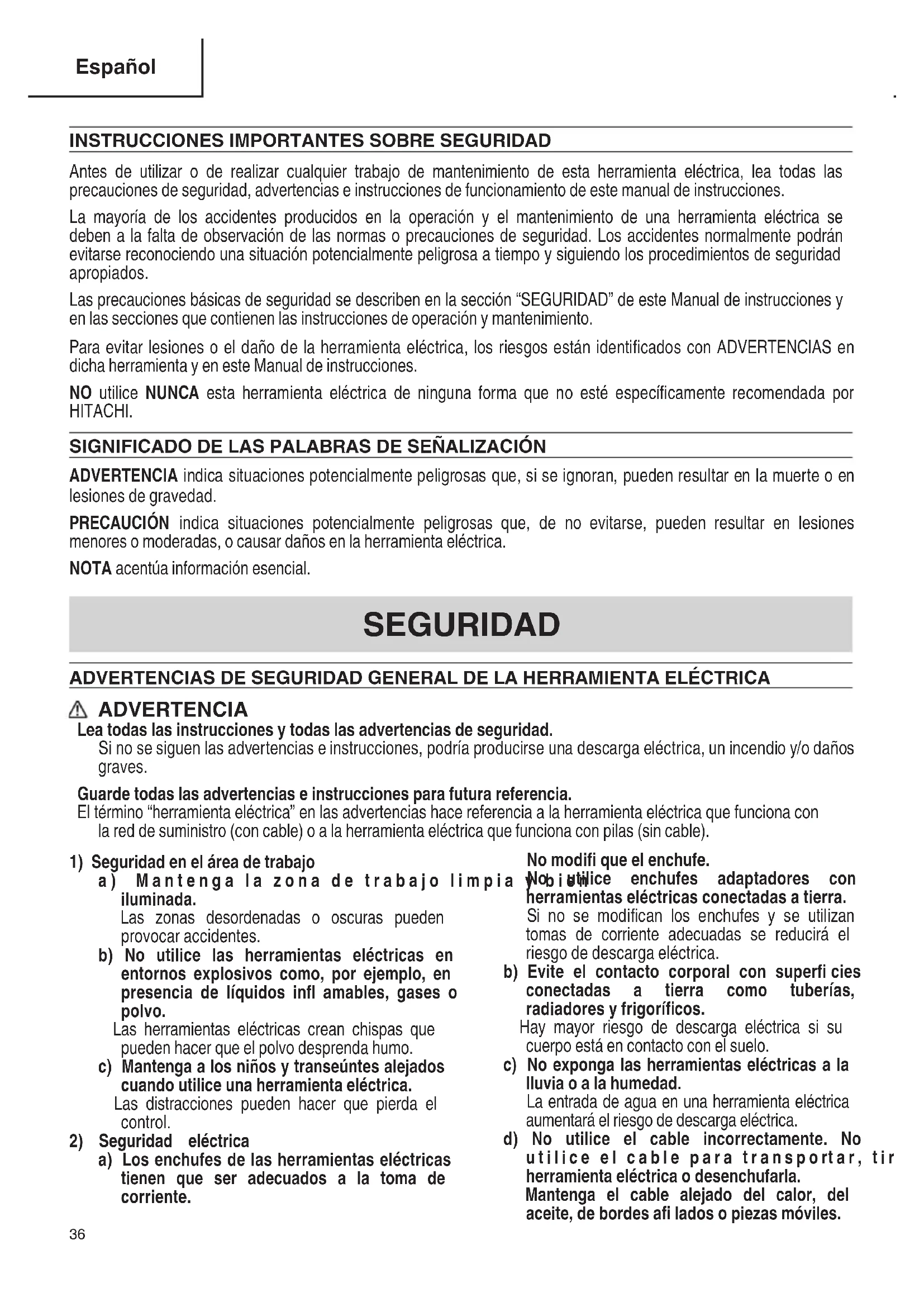 Antes de utilizar o de realizar cualquier trabajo de mantenimiento de esta herramienta eléctrica, lea todas las precauciones de seguridad, advertencias e instrucciones de funcionamiento de este manual de instrucciones. La mayoría de los accidentes producidos en la operación y el mantenimiento de una herramienta eléctrica se deben a la falta de observación de las normas o precauciones de seguridad. Los accidentes normalmente podrán evitarse reconociendo una situación potencialmente peligrosa a tiempo y siguiendo los procedimientos de seguridad apropiados. Las precauciones básicas de seguridad se describen en la sección “SEGURIDAD” de este Manual de instrucciones y en las secciones que contienen las instrucciones de operación y mantenimiento. Para evitar lesiones o el daño de la herramienta eléctrica, los riesgos están identifi cados con ADVERTENCIAS en dicha herramienta y en este Manual de instrucciones. NO utilice NUNCA esta herramienta eléctrica de ninguna forma que no esté específi camente recomendada por HITACHI. SIGNIFICADO DE LAS PALABRAS DE SEÑALIZACIÓN ADVERTENCIA indica situaciones potencialmente peligrosas que, si se ignoran, pueden resultar en la muerte o en lesiones de gravedad. PRECAUCIÓN indica situaciones potencialmente peligrosas que, de no evitarse, pueden resultar en lesiones menores o moderadas, o causar daños en la herramienta eléctrica. NOTA acentúa información esencial. SEGURIDAD ADVERTENCIAS DE SEGURIDAD GENERAL DE LA HERRAMIENTA ELÉCTRICA ADVERTENCIA Lea todas las instrucciones y todas las advertencias de seguridad. Si no se siguen las advertencias e instrucciones, podría producirse una descarga eléctrica, un incendio y/o daños graves. Guarde todas las advertencias e instrucciones para futura referencia. El término “herramienta eléctrica” en las advertencias hace referencia a la herramienta eléctrica que funciona con la red de suministro (con cable) o a la herramienta eléctrica que funciona con pilas (sin cable).