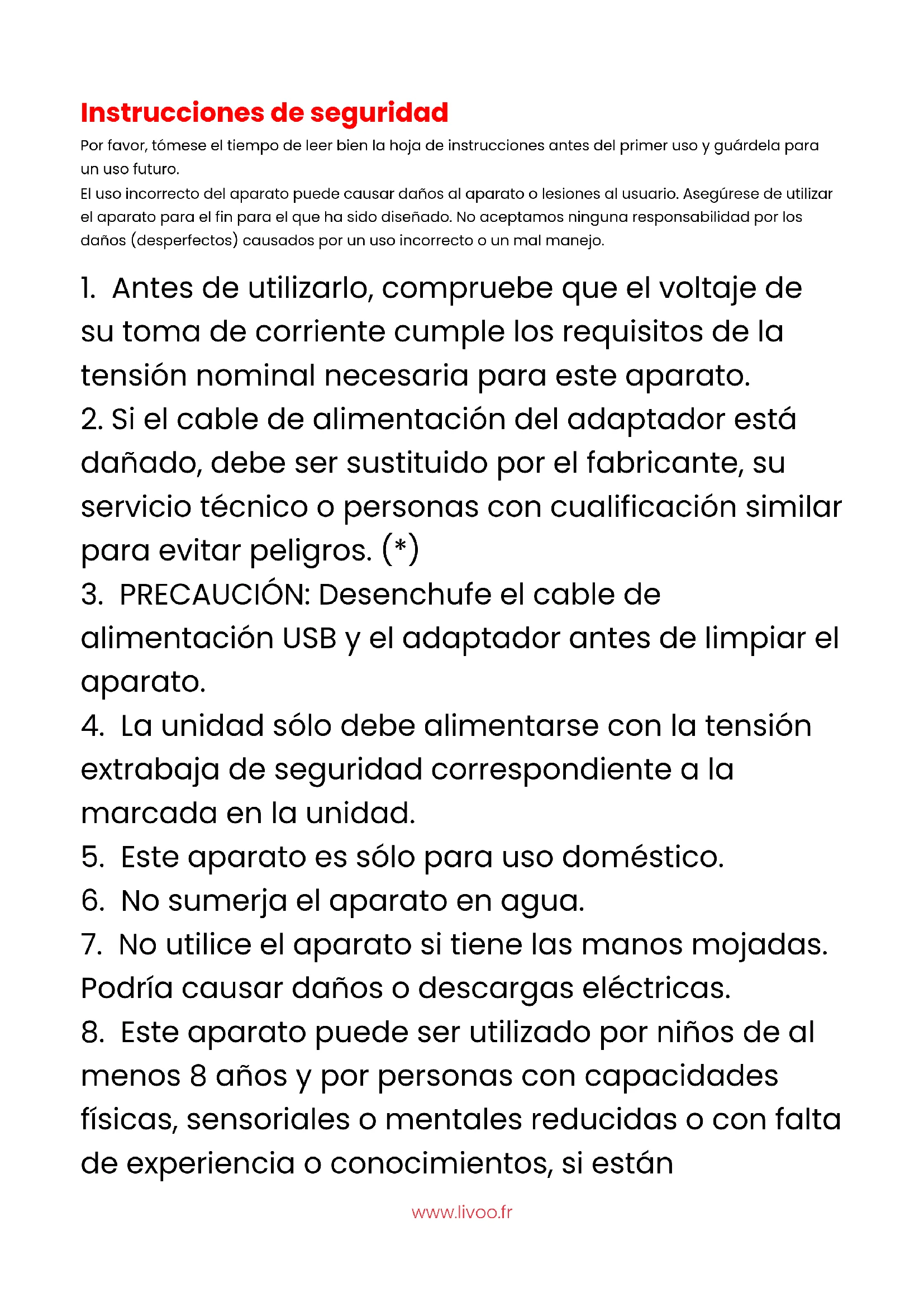 @livoo_officiel @Livoo @Livoo ESwww.livoo.fr Instrucciones de seguridad Por favor, tómese el tiempo de leer bien la hoja de instrucciones antes del primer uso y guárdela para un uso futuro. El uso incorrecto del aparato puede causar daños al aparato o lesiones al usuario. Asegúrese de utilizar el aparato para el fin para el que ha sido diseñado. No aceptamos ninguna responsabilidad por los daños (desperfectos) causados por un uso incorrecto o un mal manejo.