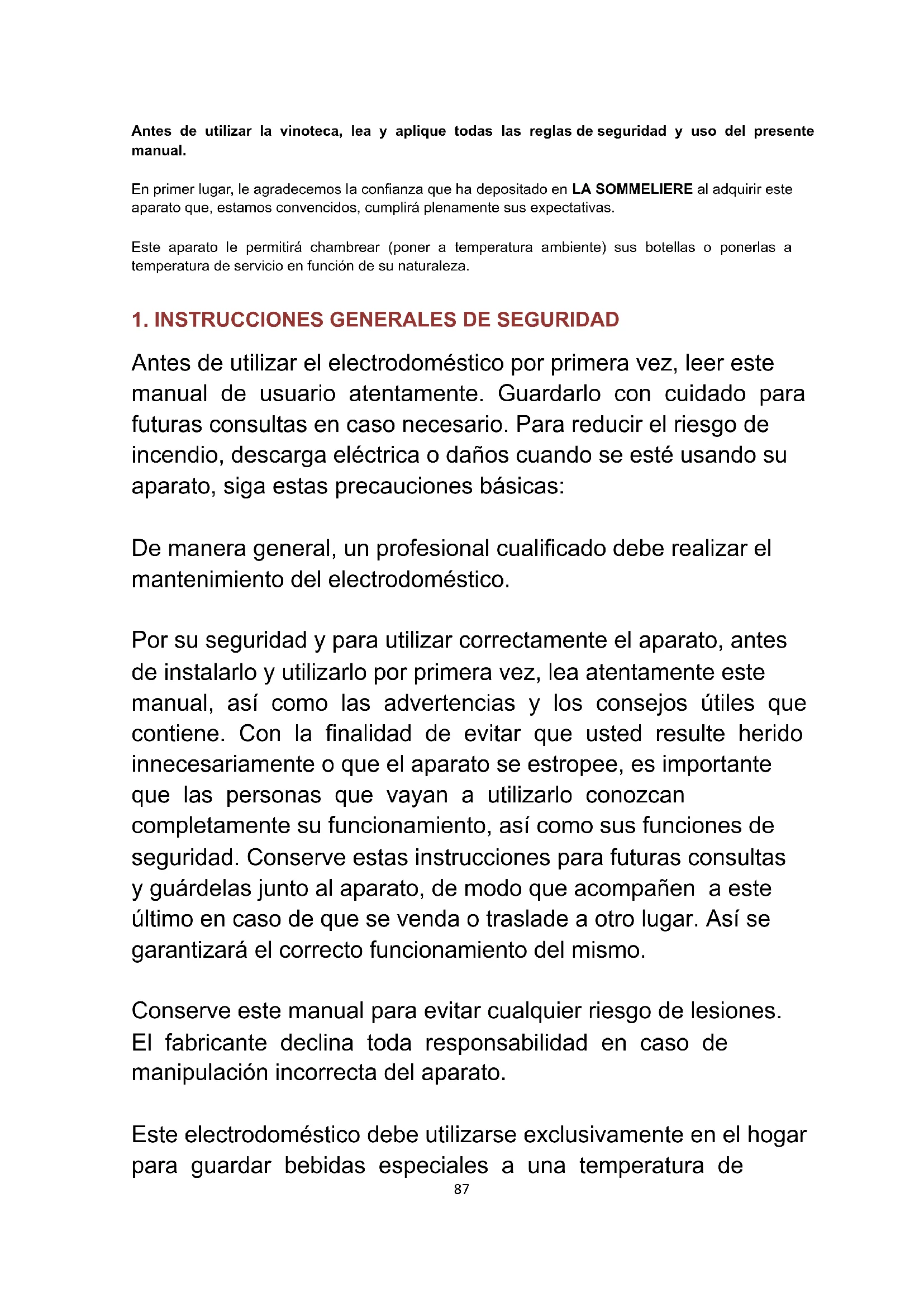 Antes de utilizar el electrodoméstico por primera vez, leer este manual de usuario atentamente. Guardarlo con cuidado para futuras consultas en caso necesario. Para reducir el riesgo de incendio, descarga eléctrica o daños cuando se esté usando su aparato, siga estas precauciones básicas: De manera general, un profesional cualificado debe realizar el mantenimiento del electrodoméstico. Por su seguridad y para utilizar correctamente el aparato, antes de instalarlo y utilizarlo por primera vez, lea atentamente este manual, así como las advertencias y los consejos útiles que contiene. Con la finalidad de evitar que usted resulte herido innecesariamente o que el aparato se estropee, es importante que las personas que vayan a utilizarlo conozcan completamente su funcionamiento, así como sus funciones de seguridad. Conserve estas instrucciones para futuras consultas y guárdelas junto al aparato, de modo que acompañen a este último en caso de que se venda o traslade a otro lugar. Así se garantizará el correcto funcionamiento del mismo. Conserve este manual para evitar cualquier riesgo de lesiones. El fabricante declina toda responsabilidad en caso de manipulación incorrecta del aparato. Este electrodoméstico debe utilizarse exclusivamente en el hogar para guardar bebidas especiales a una temperatura de88 almacenamiento superior a la del compartimento de almacenamiento para productos frescos. No está previsto bajo ningún concepto para guardar productos alimenticios frescos. Asegurarse de que la tensión de la instalación eléctrica corresponda con la placa de identificación del electrodoméstico; este último debe estar conectado a un sistema a tierra autorizado. Las reparaciones o conexiones incorrectas pueden causar riesgos para la seguridad. En caso de duda, solicitar a un profesional que compruebe la instalación eléctrica. Esta unidad debe estar correctamente conectada a la toma de corriente a tierra para su protección. No cortar ni retirar el hilo de puesta a tierra del cable de la red eléctrica suministrado. Por razones de seguridad, no utilizar un cable alargador eléctrico. Si el electrodoméstico está estropeado (p. ej., si ha recibido un golpe fuerte) o ha sufrido algún daño (subida de tensión debida a relámpagos, inundaciones o incendios), puede resultar peligroso utilizarlo. Desconectar el enchufe de la red eléctrica y solicitar a un reparador profesional autorizado que compruebe el electrodoméstico. Para impedir los peligros, no reemplace usted mismo el cable estropeado de la red eléctrica. Ponerse en contacto con el distribuidor, un centro de reparación autorizado o un reparador profesional. Este electrodoméstico debe colocarse de tal manera que el enchufe de la red eléctrica esté accesible. No mover el electrodoméstico cuando esté lleno: podría deformarse su estructura y no ser posible su reparación. Las partes eléctricas no deben estar directamente accesibles.89