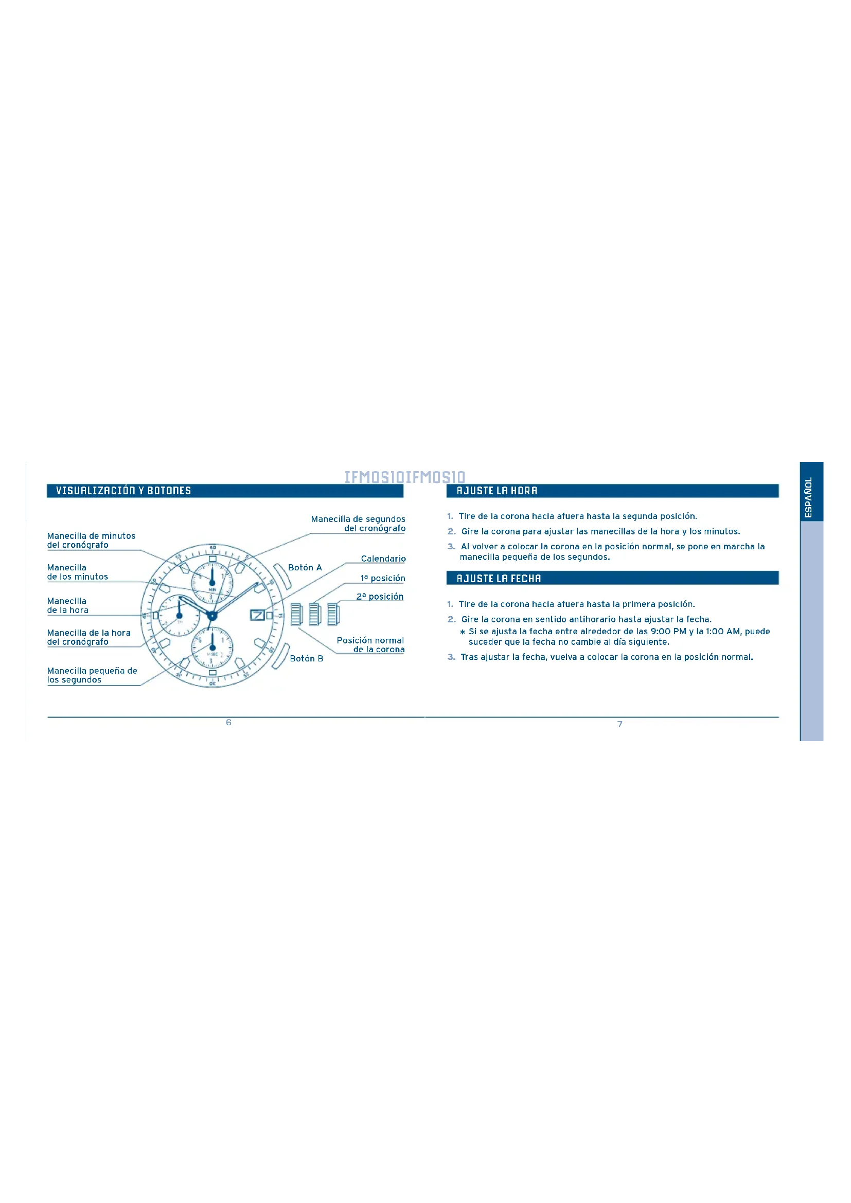 No presione la corona en la posición normal mientras la manecilla de los segundos del cronógrafo vuelve a la posición cero. La manecilla de los segundos se para cuando presiona la corona para ponerla en la posición normal, y esta posición de parada será considerada como posición cero. Este procedimiento se debe realizar cuando la manecilla de los segundos del cronógrafo no vuelve a la posición cero después de haber reposicionado el cronógrafo, e incluso después de haber reemplazado la pila.11 ENGLISH En aplicación de la normativa sobre los desechos de equipos eléctricos y electrónicos, los productos de relojería de cuarzo que se encuentran al final de su vida útil deben ser sometidos a una recogida selectiva en vistas a su posterior tratamiento. También puede depositar nuestros productos de relojería de cuarzo en uno de nuestros puntos de venta autorizados, así como en cualquier punto de recogida habilitado. La recogida selectiva, el tratamiento, la valoración y el reciclaje contribuyen a la salvaguarda de nuestro medio ambiente y a la protección de nuestra salud. IFM0S10 INSTRUCTION MANUAL STOPWATCH Displays and buttons