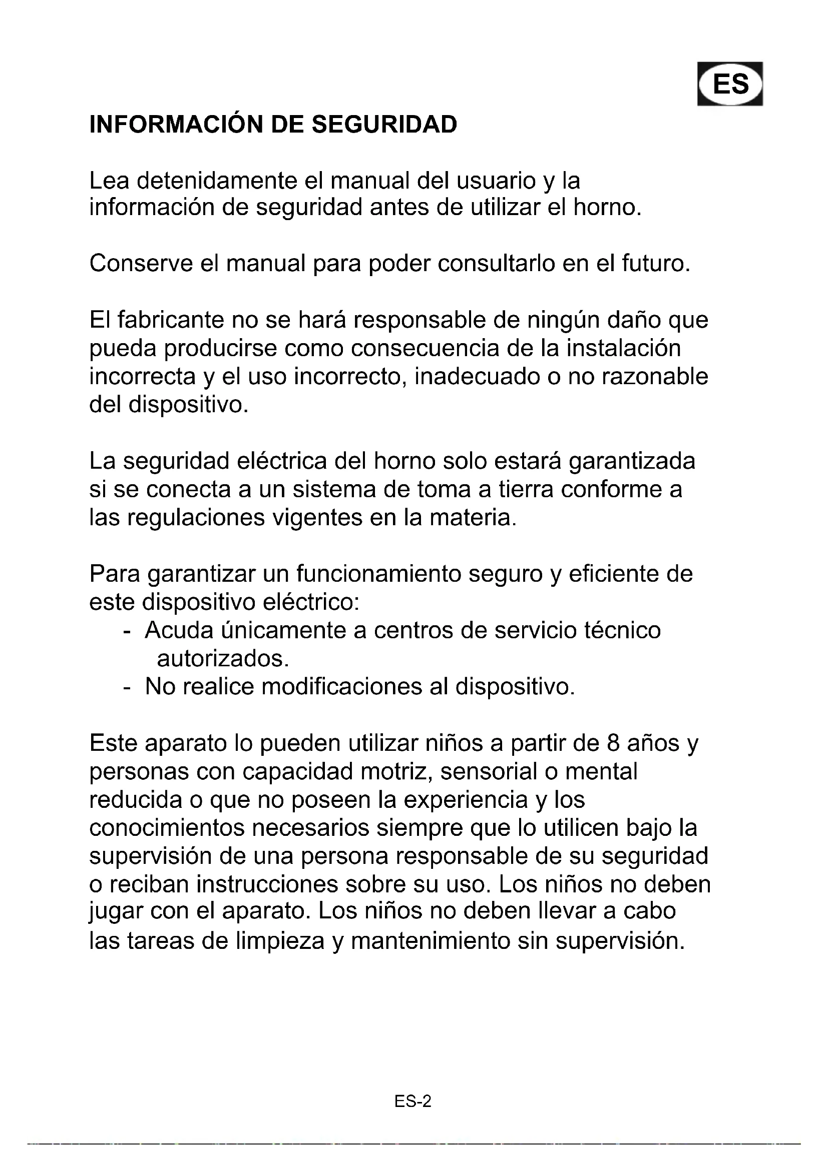 Lea detenidamente el manual del usuario y la información de seguridad antes de utilizar el horno. Conserve el manual para poder consultarlo en el futuro. El fabricante no se hará responsable de ningún daño que pueda producirse como consecuencia de la instalación incorrecta y el uso incorrecto, inadecuado o no razonable del dispositivo. La seguridad eléctrica del horno solo estará garantizada si se conecta a un sistema de toma a tierra conforme a las regulaciones vigentes en la materia. Para garantizar un funcionamiento seguro y eficiente de este dispositivo eléctrico: - Acuda únicamente a centros de servicio técnico autorizados. - No realice modificaciones al dispositivo. Este aparato lo pueden utilizar niños a partir de 8 años y personas con capacidad motriz, sensorial o mental reducida o que no poseen la experiencia y los conocimientos necesarios siempre que lo utilicen bajo la supervisión de una persona responsable de su seguridad o reciban instrucciones sobre su uso. Los niños no deben jugar con el aparato. Los niños no deben llevar a cabo las tareas de limpieza y mantenimiento sin supervisión. ES-2Este dispositivo no es un juguete. No deje a los niños desatendidos cerca del dispositivo. No deje que los niños toquen el dispositivo o sus controles durante su funcionamiento o inmediatamente después del mismo. CAUCIÓN: Para evitar los riesgos derivados de un restablecimiento accidental del disyuntor térmico, este aparato no debe recibir alimentación de un dispositivo de conmutación externo como, por ejemplo, un temporizador, ni ser conectado a un circuito que encienda y apague regularmente la empresa de suministro Compruebe que el dispositivo se instale de manera que permita la desconexión de la alimentación eléctrica con una distancia de apertura de contacto que garantice una desconexión completa en condiciones de sobretensión de categoría III. Los medios de desconexión deben estar incorporados en el cableado fijo de acuerdo con las reglas de cableado. Use solo la sonda de temperatura recomendada para este horno. El aparato no debe instalarse detrás de una puerta decorativa para evitar el sobrecalentamiento. Con el objetivo de evitar el sobrecalentamiento, el aparato no deberá instalarse tras una puerta decorativa. Riesgo de sufrir quemaduras Durante su uso, el aparato se calienta. Se debe tener precaución para evitar tocar los elementos calefactores dentro del horno. Mantenga alejados a los niños menores 8 años salvo que sean supervisados continuamente. ES-3¡Riesgo de sufrir quemaduras! Debido al aire caliente que sale del horno, el extremo del asidero de la puerta puede estar más caliente. Compruebe siempre que los mandos de control estén en su posición de apagado cuando el horno no esté en uso. ADVERTENCIA: Asegúrese de que el aparato está apagado antes de sustituir la lámpara para evitar la posibilidad de una descarga eléctrica. No use limpiadores abrasivos ni rascadores metálicos afilados para limpiar el cristal de la puerta del horno/el cristal de la tapa con bisagras de la placa (según proceda), ya que puede rayar la superficie, lo cual podría dar lugar a la rotura del cristal. No use limpiadores a vapor ni chorros de agua directos. Si el cable de alimentación está dañado, debe ser reemplazado por el fabricante, su agente de servicio o personas igualmente cualificadas, para evitar cualquier tipo de riesgo.
