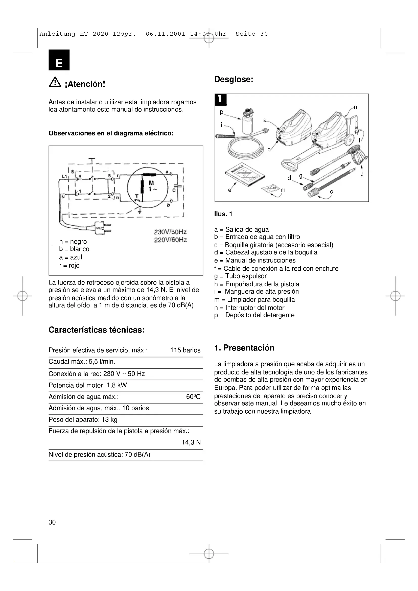 Avería Causa Remedio - La bomba no alcanza la presión prevista - Fluctuaciones de presión - Funcionamiento ruidoso - Pérdidas de agua o de - aceite de la boquilla - El motor eléctrico no arranca - El motor hace ruido, pero no arranca - El cable de alimentación está dañado. - Boquilla desgastada o equivocada. - Filtro del agua sucio. - Alimentación de agua insuficiente - Aspiración de aire - Falta de barrido de la bomba. - El botón de ajuste está mal colocado - Existe aspiración de agua del depósito externo. - La temperatura del agua es demasiado elevada. - La boquilla está bloqueada. - La temperatura es demasiado elevada. - Aspiración de agua - Juntas desgastadas - Falta de tensión - Tensión de la red por debajo del valor mínimo. - Caída de la tensión causada por el cable de prolongación (Sección insuficiente, longitud excesiva). - La limpiadora ha estado parada demasiado tiempo - Sustituir la boquilla. - Limpiar el filtro. - Abrir completamente el grifo del agua. - Comprobar las conexiones. - Desconectar la limpiadora y hacer funcionar la pistola hasta que salga un chorro de agua uniforme. Conectar de nuevo. - Empujar el cabezal hacia atrás. - Conectar la limpiadora al suministro de agua. - Reducir la temperatura. - Usar el dispositivo de limpieza. - Reducir la temperatura. - Comprobar las conexiones de agua de entrada y salida. - Sustituir las juntas - Comprobar el enchufe y si hay corriente en la red - Comprobar que el conducto sea adecuado. - Seguir las instrucciones para cable de prolongación. - Desbloquear el motor por la parte trasera, usando una llave. (Ilus. 6b). - Informar al servicio de asistencia técnica. En caso de que el motor se pare durante el trabajo y no arranque de nuevo será preciso esperar unos 2 ò 3 minutos antes de conectarlo otra vez. Este paro significa que el guardamotor ha sido activado. De repetirse el fallo será preciso consultar al servicio de asistencia técnica. Anleitung HT 2020-12spr. 06.11.2001 14:00 Uhr Seite 36 Atenção! Antes de instalar e usar o aparelho de limpeza a alta presssão, leia atentamente este manual. Identificação no esquema eléctrico: Força de repulsão na pistola, à pressão máxima: 14,3 N. Nível da pressão acústica, medido com sonómetro à altura dos ouvidos, à distância de 1 m: 70 dB(A). Dados técnicos: Pressão efectiva em serviço, máx.: 115 bars Débito máx.: 5,5 litros/min Ligação à rede: 230 V c.a., 50 Hz Potência do motor: 1,8 kW Admissão de água, máx.: 60 °C Admissão de água, máx.: 10 bars Peso do aparelho: 13 kg Força de repulsão na pistola, à pressão máxima: 14,3 N Nível da pressão acústica, medido 70 dB(A) Vista geral: Fig. 1 a = Saída de água b = Entrada de água com filtro c = Bocal rotativo (acessório especial) d = Cabeça do bocal ajustável e = Manual de operação f = Cabo de ligação à rede, com ficha g = Tubo ejector h = Punho da pistola i = Mangueira de alta pressão m = Limpador da cabeça do bocal n = Interruptor do motor p = Depósito de detergente